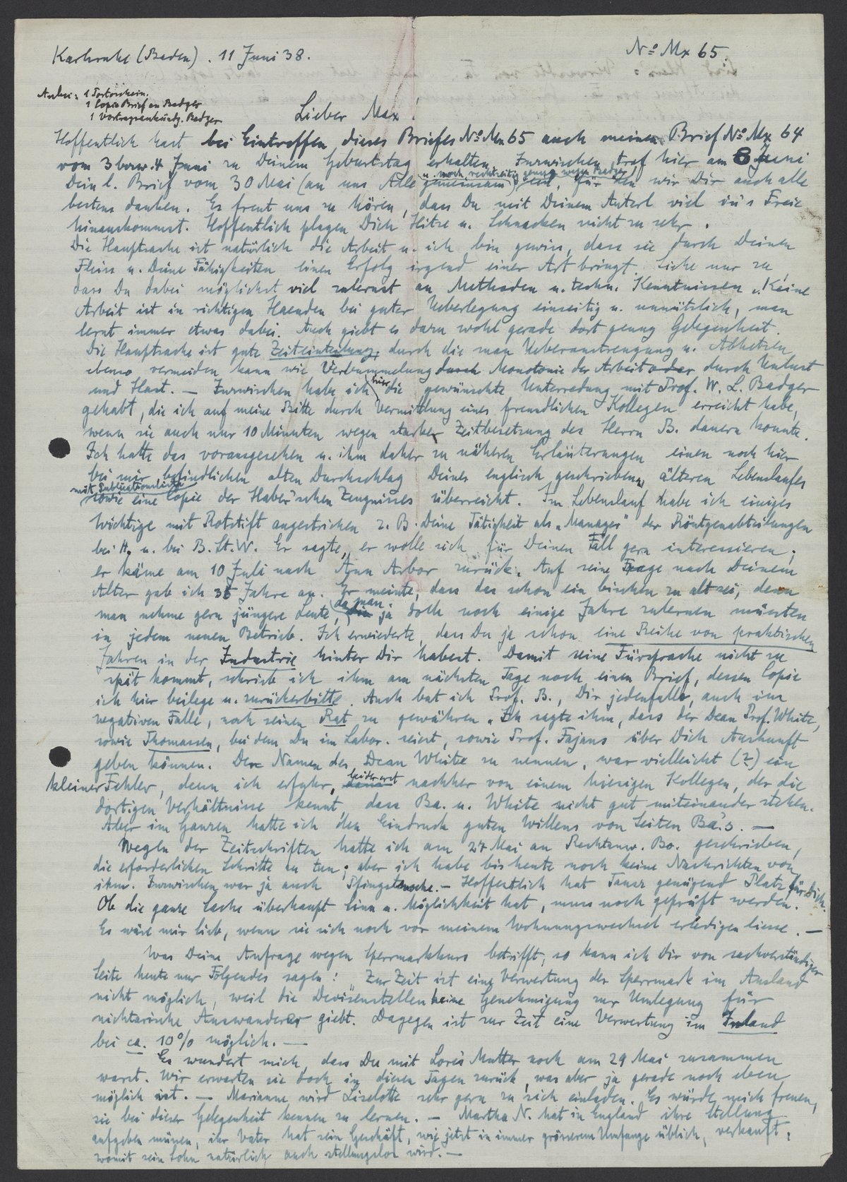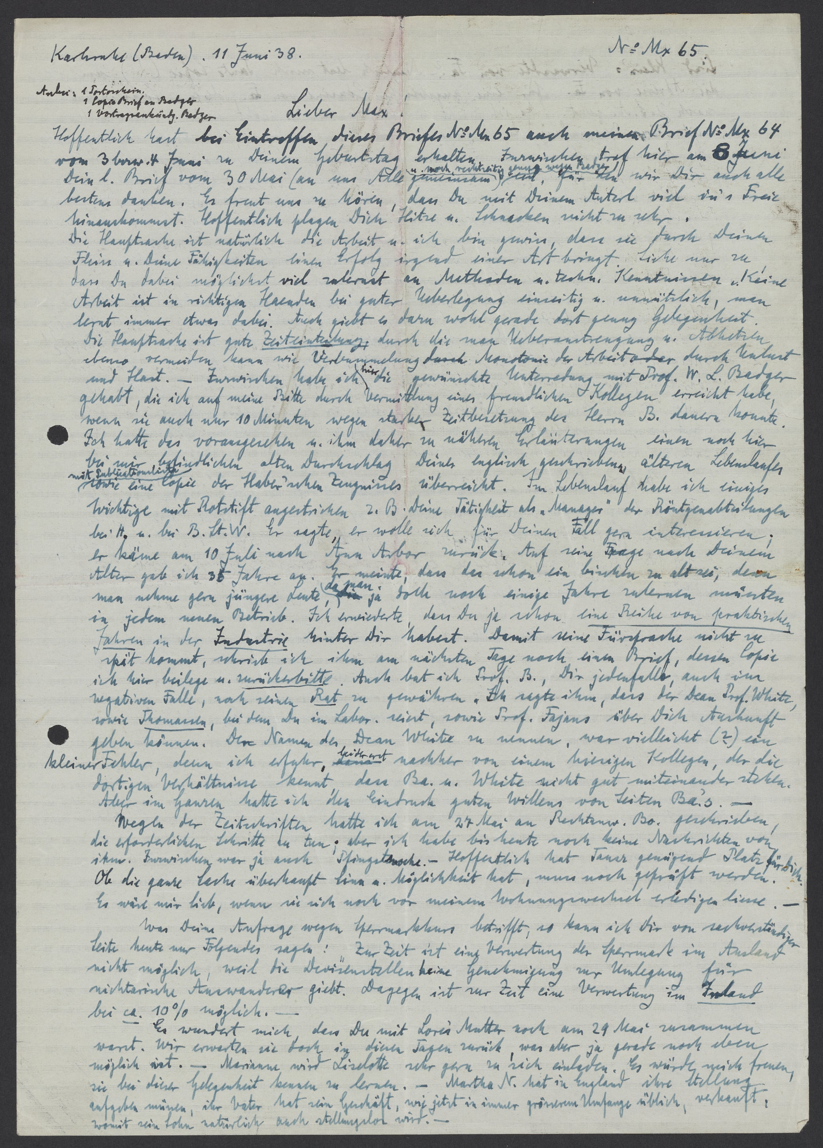 Hoffentlich hast bei Eintreffen, dieses Briefes No Mx 65 auch meinen Brief Mx 64 von 3 bzw. 4 Juni zu Deinem Geburtstag erhalten. Inzwischen traf hier am 8 Juni Dein lieber Brief vom 30 Mai (an uns Alle gemeinsam) u. noch rechtzeitig ganz wegen Badger ein, für den wir Dir auch alle bestens danken. Es freut uns zu hören, das da mit Deinem Auterl viel in’s Freie hinauskommt. Hoffentlich plagen Dich Hitze u. Schnacken nicht zu sehr. Die Hauptsache ist natürlich die Arbeit u. ich bin gewiss, dass sie durch Deinen Fleiss u. deine Fähigkeiten einen Erfolg irgend einer Art bringt. Siehe nur zu, dass Du dabei möglichst viel zulernst an Methoden u. techn. Kenntnissen u. keine Arbeit ist in richtigen Händen bei guter Überlegung einseitig u. unnuetzlich, man lernt immer etwas dabei. Auch giebt es dazu wohl gerade dort genug Gelegenheit. Die Hauptsache ist gute Zeiteinteilung, durch die man Überanstrengung u. Abhetzen ebenso vermeiden wie Verleumdung durch Monotonie der Arbeit oder durch Unlust u. Hast. – Inzwischen habe ich die gewünschte Unterredung, mit Prof. W.L. Badger gehabt, die ich auf meine Bitte durch Vermittlung eines freundlichen Kollegen erreicht habe, wenn sie auch nur 10 Minuten wegen starker Zeitbesetzung des Herrn B. dauern konnte. Ich hatte das vorangesehen u. ihm daher zu näheren Erläuterungen einen noch hier bei mir befindlichen alten Durchschlag Deines Englisch geschriebenen älteren Lebenslaufes mit Publikationsliste sowie eine Copie des Haber’schen Zeugnisses überreicht. Im Lebenslauf habe ich einiges Wichtige mit Rotstift angestrichen, z.B. Deine Tätigkeit als „Manager“ Röntgenabteilangen bei B.St.W. Er sagte, er wolle sich für Deinen Fäll gern interessieren; er käme am 10 Juli nach Ann Arbor zurück. Auf seine Frage nach Deinem Alter gab ich 36 Jahre an. Er meinte, dass das schon ein bisschen alt sei, denn man nehme gern jüngere Leute, da man ja doch noch einige Jahre zulernen müssten in jedem neuen Betrieb. Ich erwiderte, dass Du ja schon eine Reihe von praktischen Jahren in der Industrie hinter Dir hast habest. Damit seine Fürsprache nicht zu spät kommt, schrieb ich ihm am nächsten Tage noch einen Brief, dessen Copie ich hier beilege u. zurückerbitte. Auch bat ich Prof. B., Dir jedenfalls, auch im negativen Falle nach seinen Rat, zu gewähren. Ich sagte ihm, dass der Dean Prof. White, sowie Thomassen, bei dem Du im Labor seiest, sowie Prof. Fajans über Dich Auskunft geben können. Der Namen der Dean White zu nennen, war vielleicht (?) ein kleiner Fehler, denn ich erfuhr, leider nachher von einem hiesigen Kollegen, der die dortigen Verhältnisse kennt, dass Badger u. White nicht gut miteinander stehen. Aber im Ganzen hatte ich den Eindruck guten Willens von Seiten Badgers. –