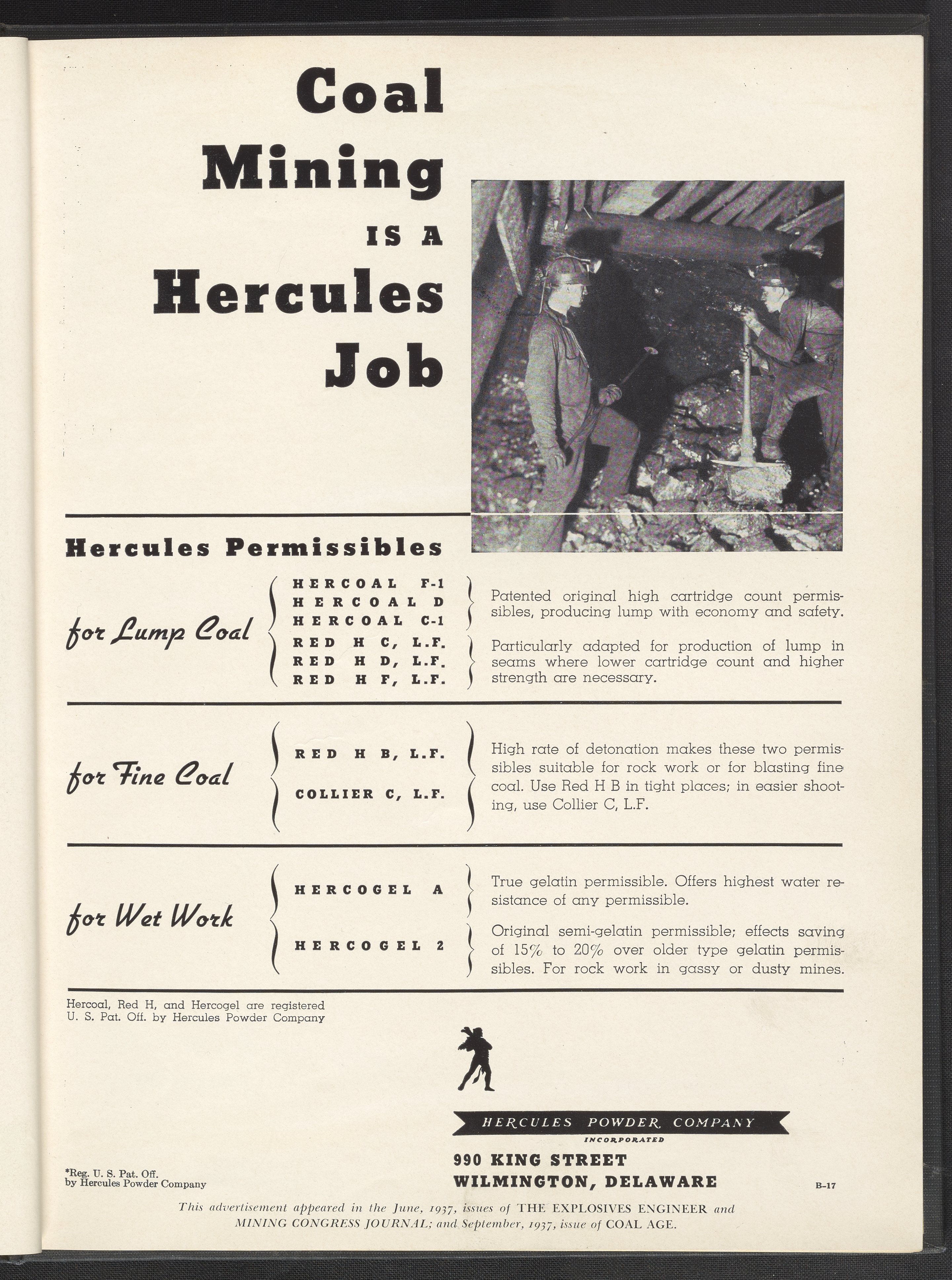 Hercules Incorporated. “Coal Mining Is a Hercules Job.” 1937 Hercules Advertisements, 1937. Records of Hercules Incorporated, Volume 1937. Science History Institute. Philadelphia. https://digital.sciencehistory.org/works/1831ck925.