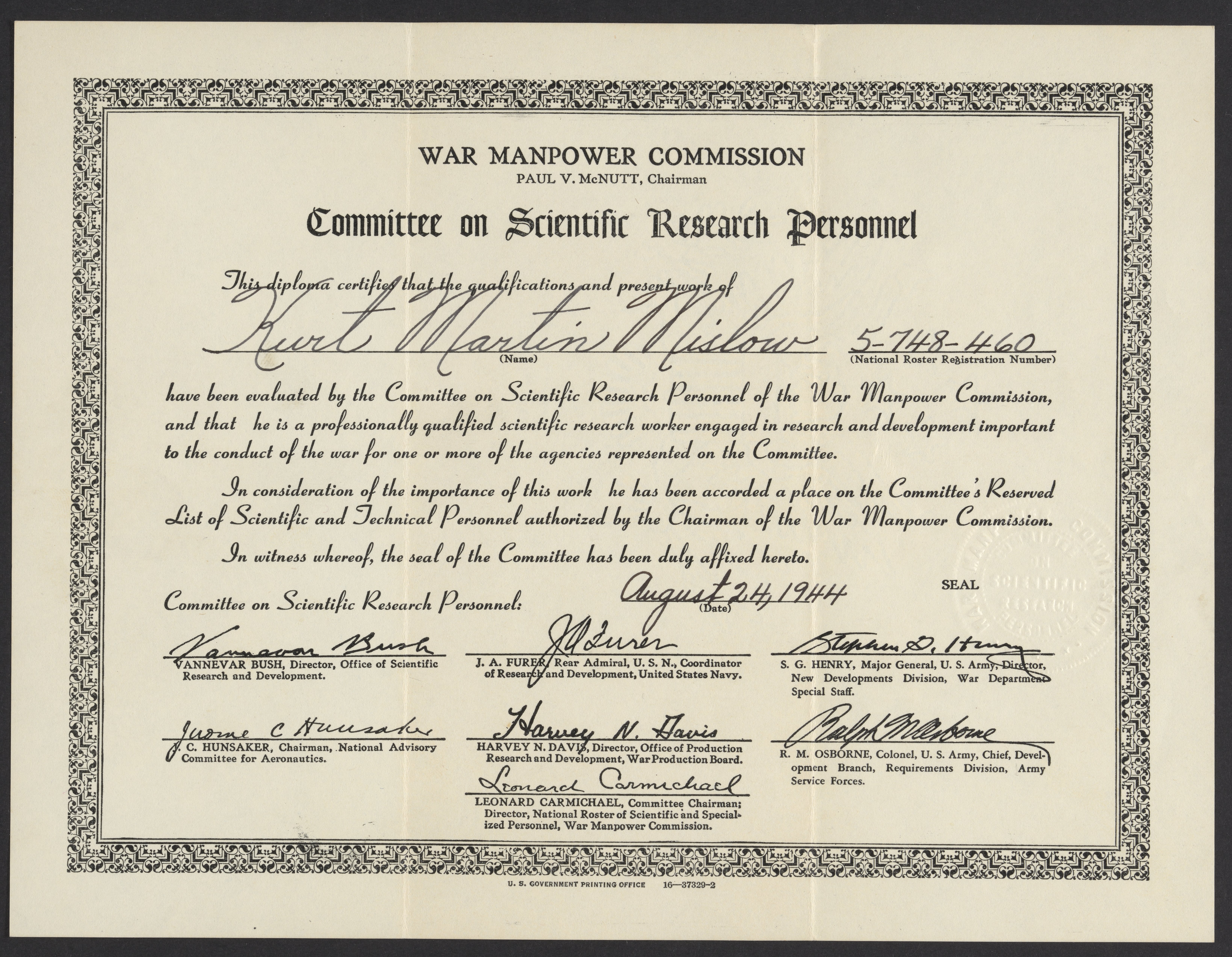 Kurt M. Mislow's (1923-2017) diploma from the War Manpower Commission. Recipients of this diploma have been evaluated by the Committee on Scientific Research Personnel of the War Manpower Commission and have been deemed professionally qualified to engage in research and development for governmental war efforts.