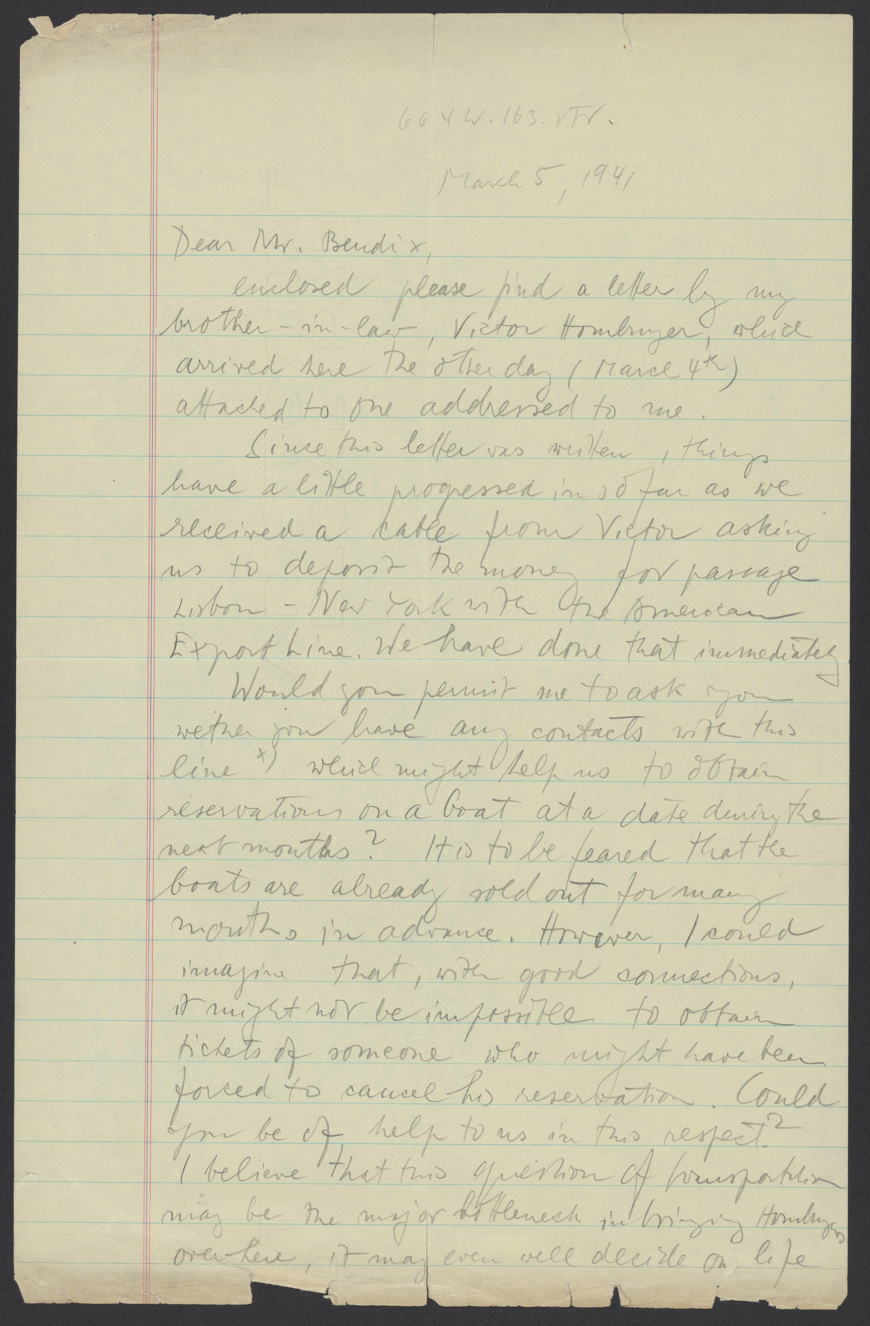 Letter from Max Bredig to Mr. Bendix, March 5, 1941