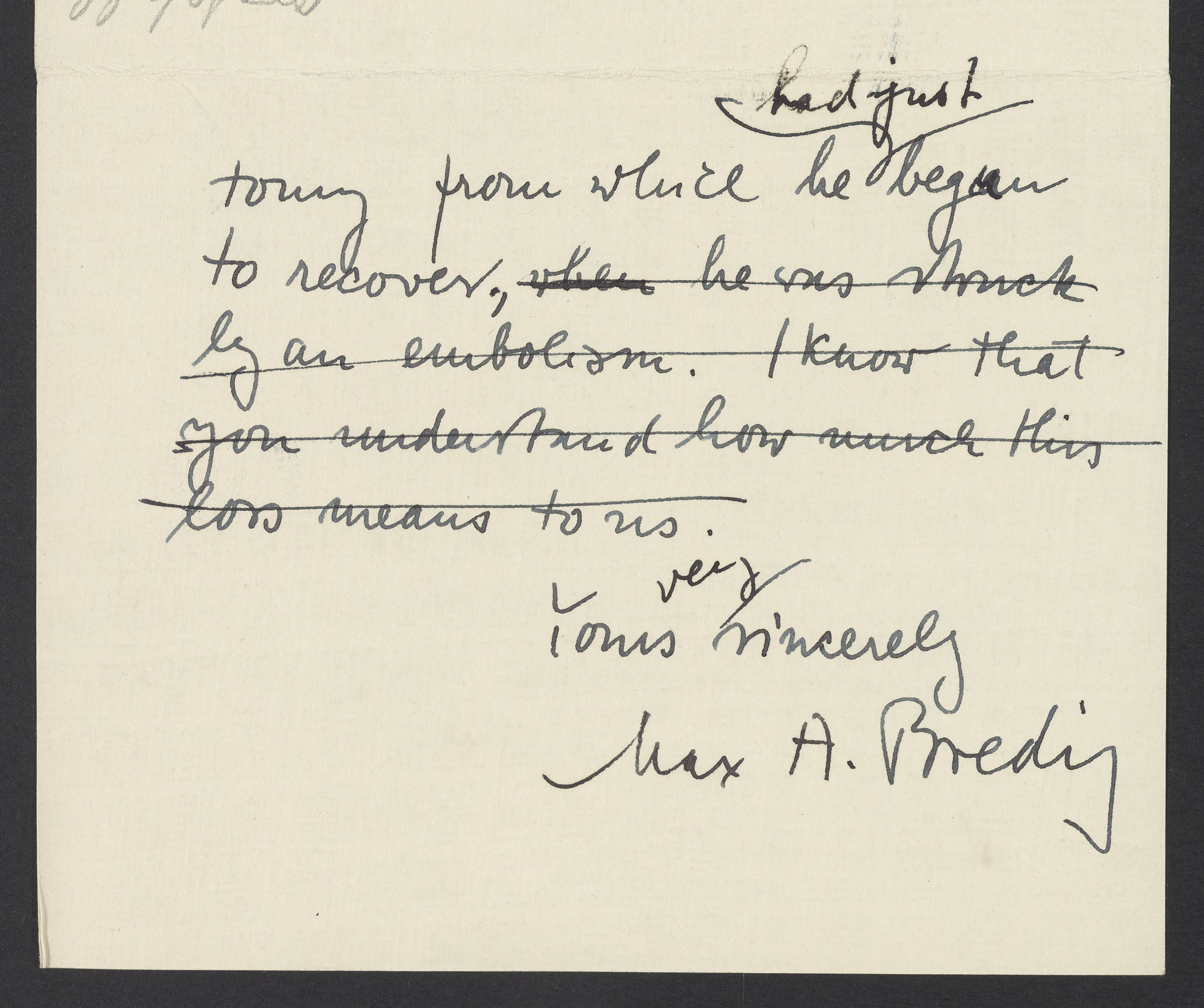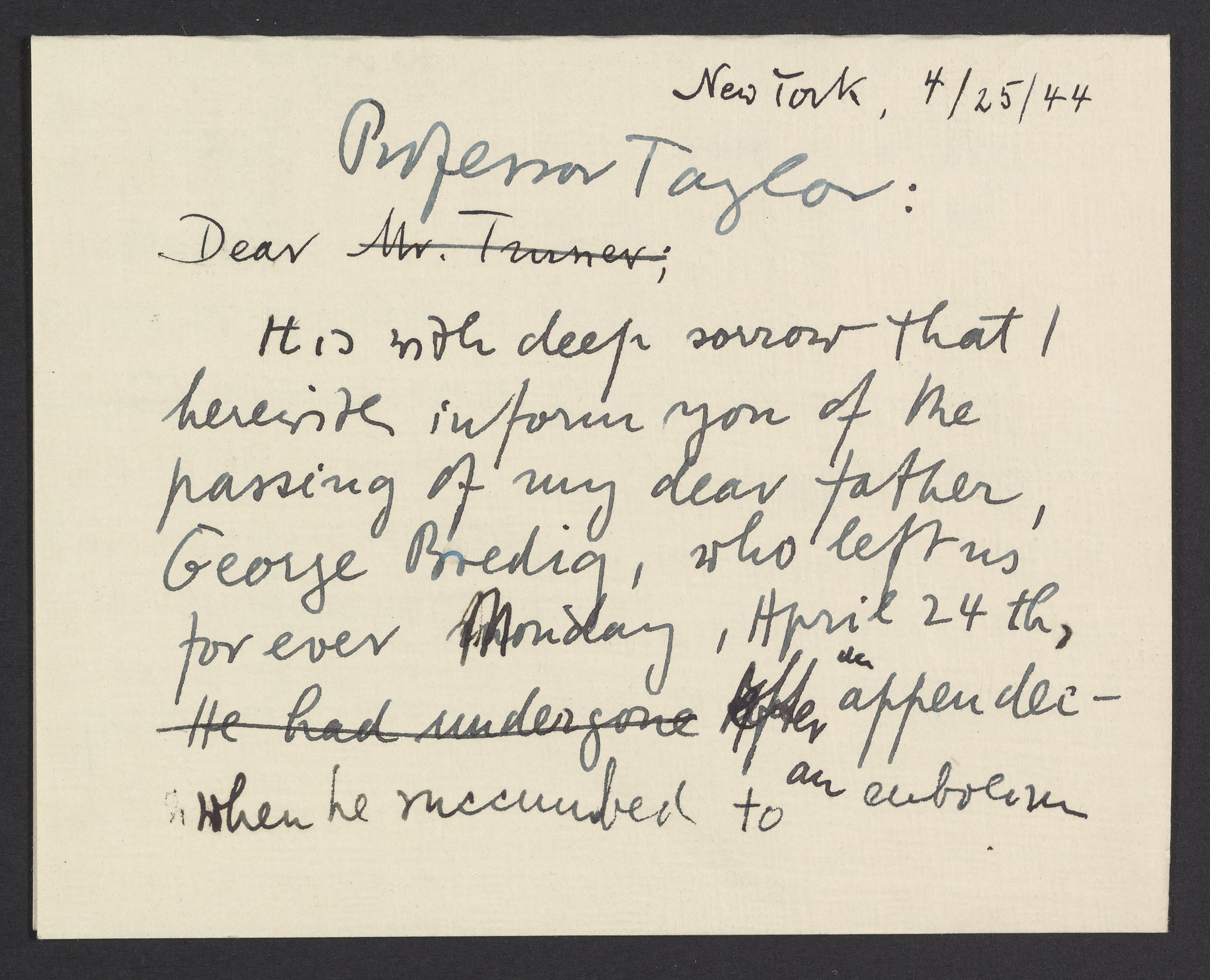 Small JPG1200 x 972px — 179 KBLarge JPG2880 x 2332px — 864 KBFull-sized JPG3128 x 2533px — 994 KBOriginal fileTIFF — 3128 x 2533px — 22.7 MBMax Albert Bredig (1902-1977) tells Hugh Stott Taylor (1890-1974) that his father, Georg Bredig (1868-1944) has passed away. Bredig thanks Taylor for helping his father obtain a position at Princeton University which was the key to him being able to leave Europe.