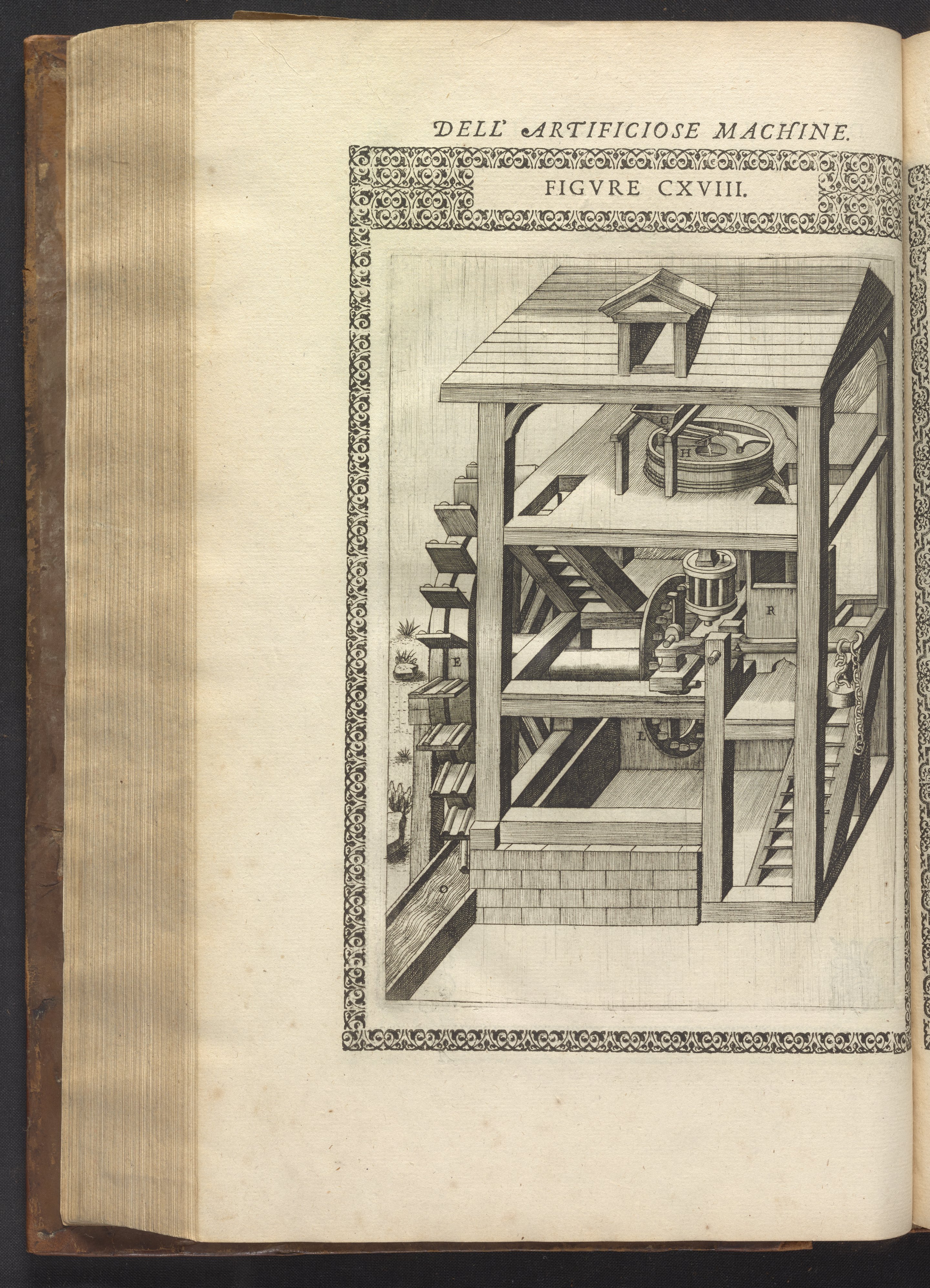 Ramelli, Agostino. “Plate 118: Grain Mill Powered by Channel Current.” In Le Diverse Et Artificiose Machine Del Capitano Agostino Ramelli. Paris, France, 1588. https://digital.sciencehistory.org/works/1c18dg00z.