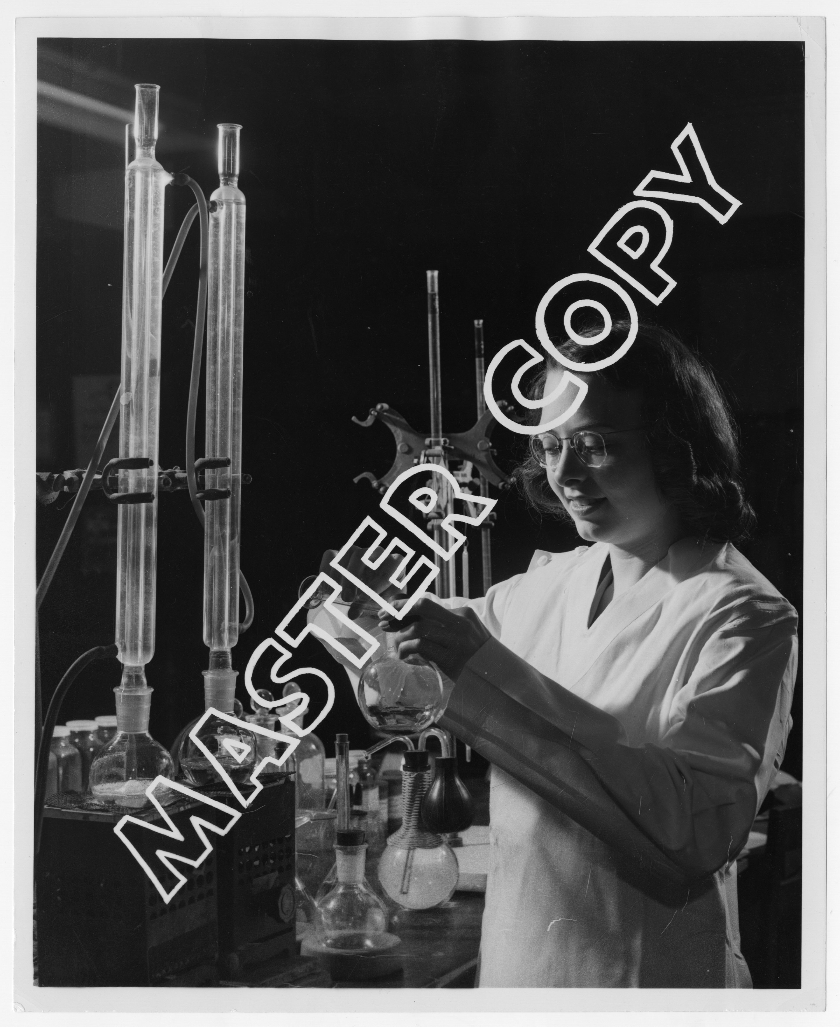 General view of chemist Delores Horne analyzing the active constituent of a weed killer in the Dow Chemical Company's Analytical Laboratory located in Midland, Michigan. Per a notation accompanying the photograph, Ms. Horne was a graduate of the University of Oklahoma. The words "Master Copy" are printed across the photograph, indicating that it was a file copy used to make reproductions for publication.
