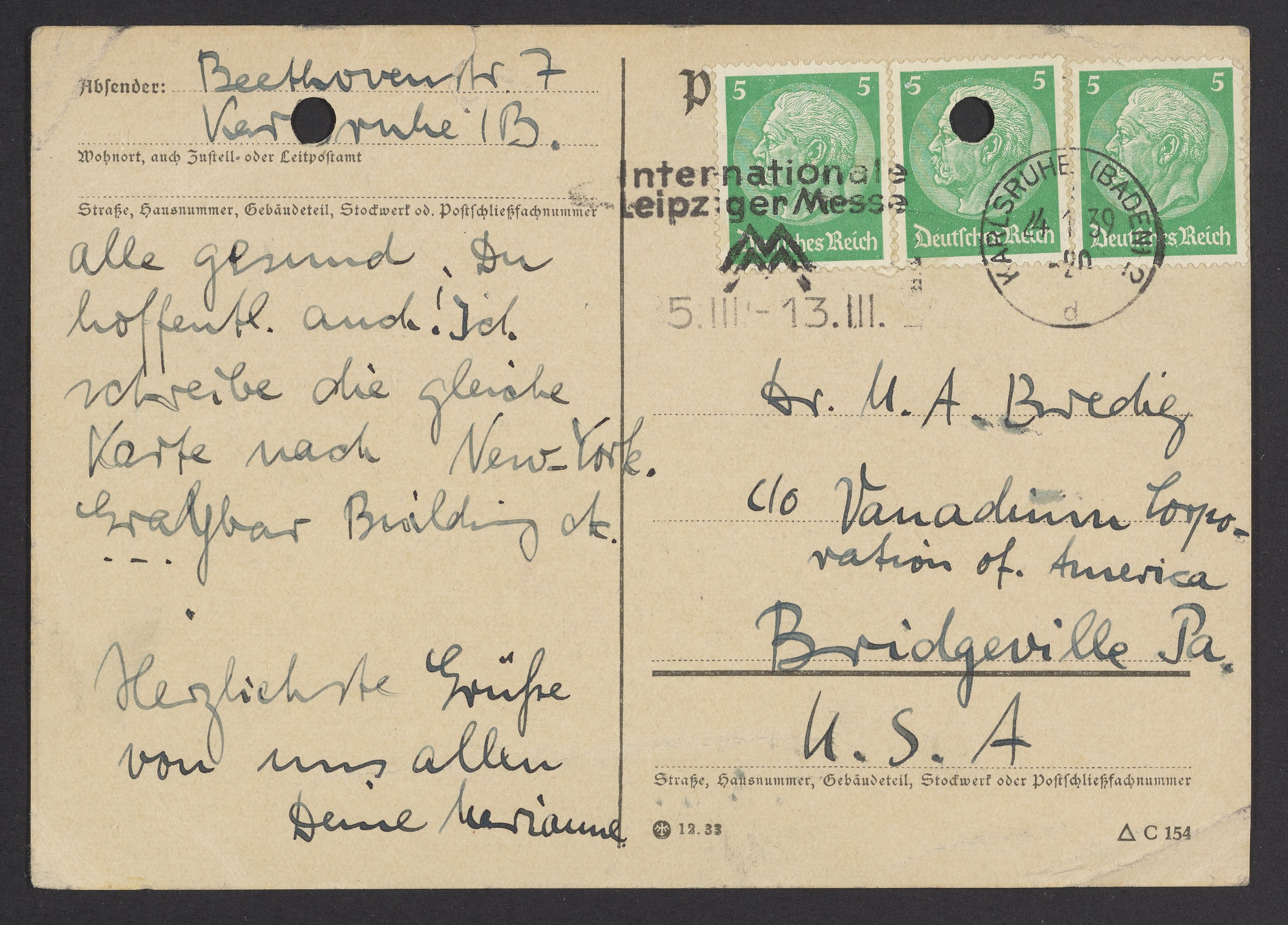 Postcard from Marianne Homburger to Max Bredig, January 24, 1939
