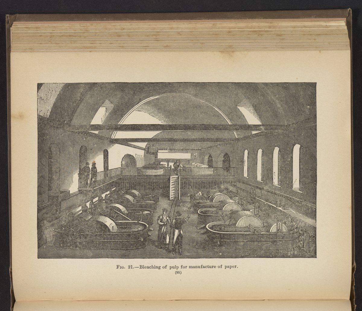 Appleton, John Howard. “Figure 21: Bleaching of Pulp for the Manufacture of Paper.” Chemistry, Developed by Facts and Principles Drawn Chiefly from the Non-Metals. Providence, Rhode Island: Providence Lithograph Company, 1884. Science History Institute. Philadelphia. https://digital.sciencehistory.org/works/1dzas6v.
