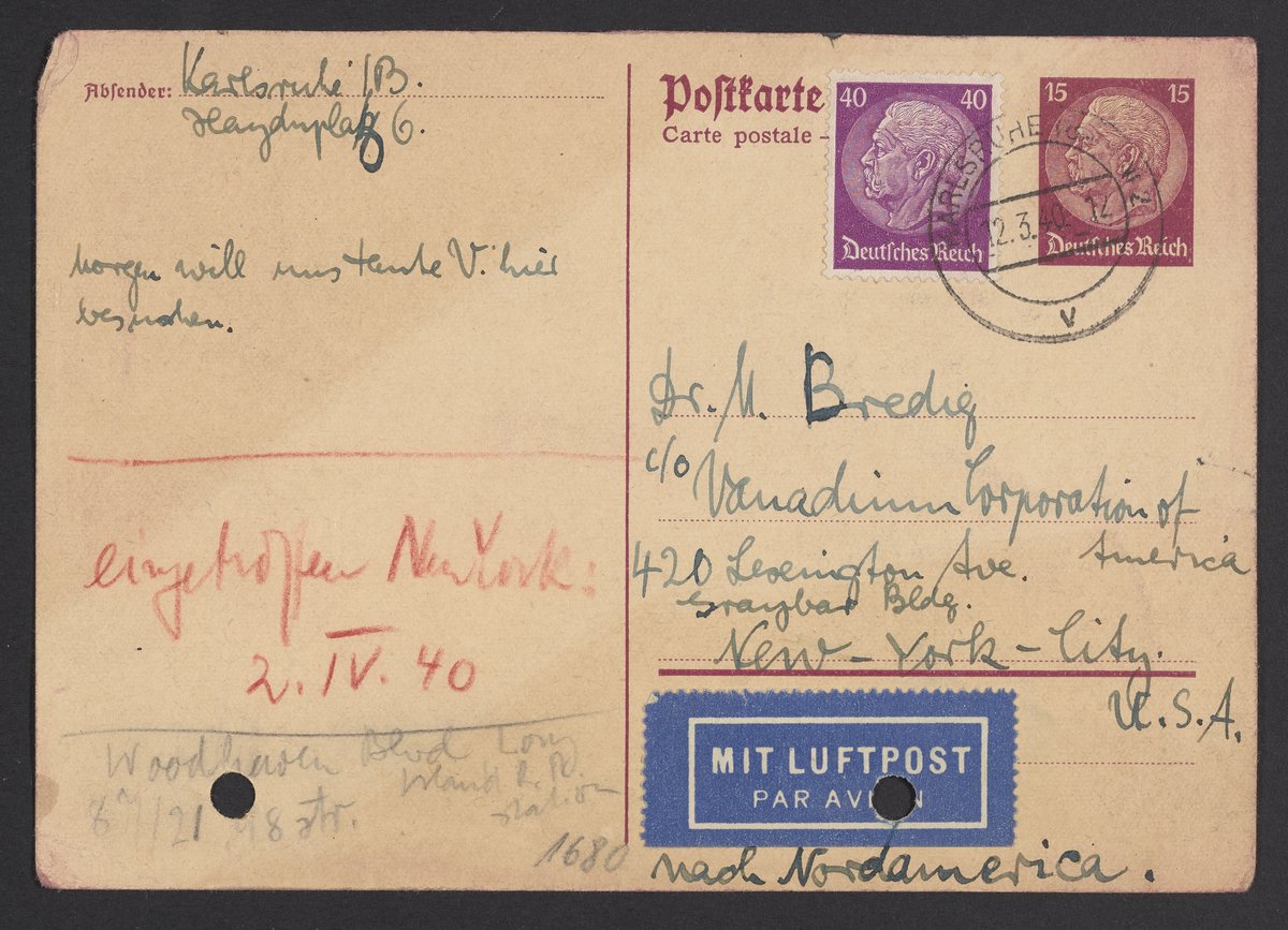 Homburger, Marianne. “Postcard from Marianne Homburger to Max Bredig, March 12, 1940,” March 12, 1940. Papers of Georg and Max Bredig, Box 8, Folder 18. Science History Institute. Philadelphia. https://digital.sciencehistory.org/works/1ew5i77.