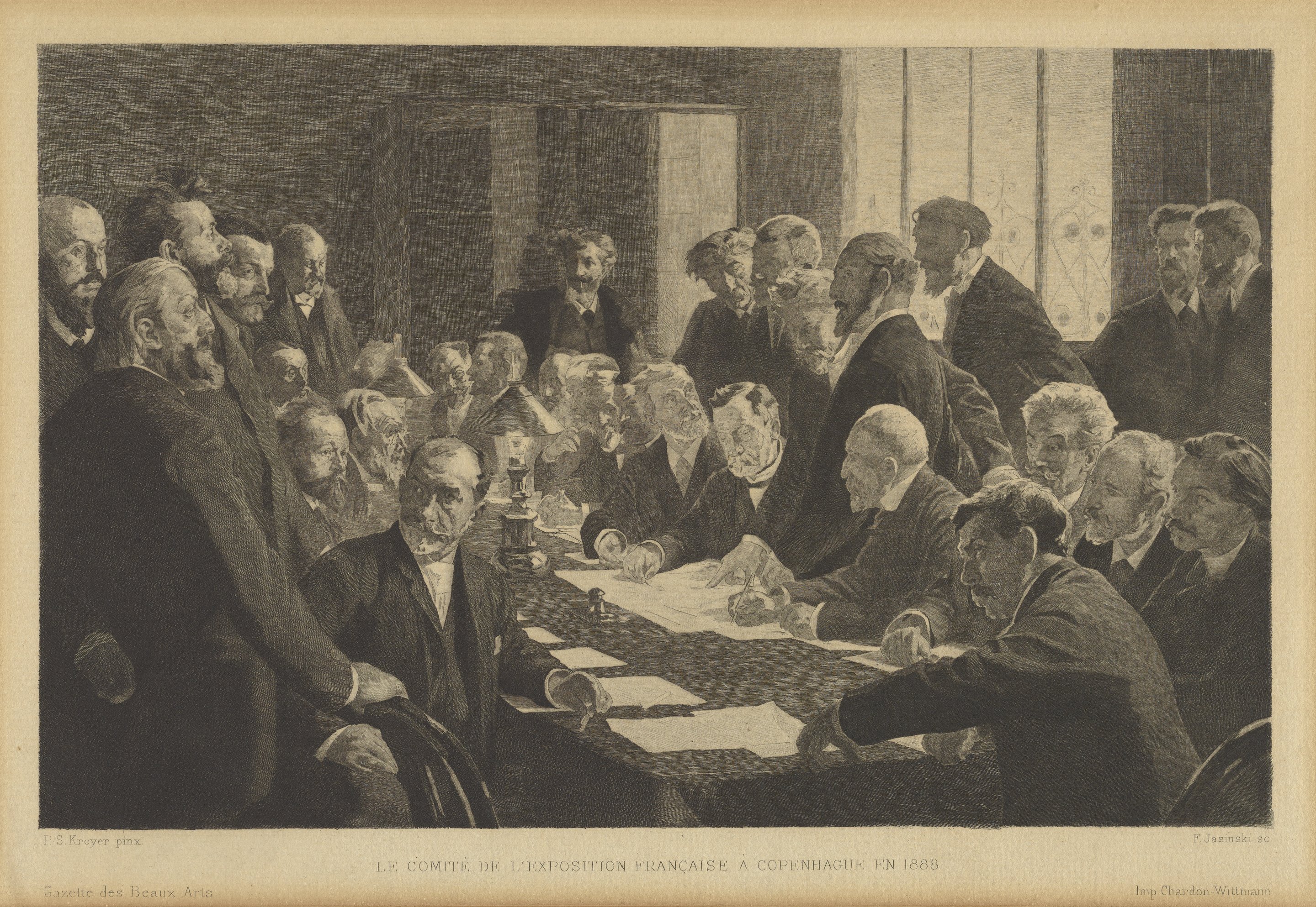 An etching by Felix Jasiński after the painting by P.S. Krøyer for the Gazette des Beaux-Arts, a French art review. The etching depicts members of the committee that organized the French Art Exhibition in Copenhagen in 1888.
