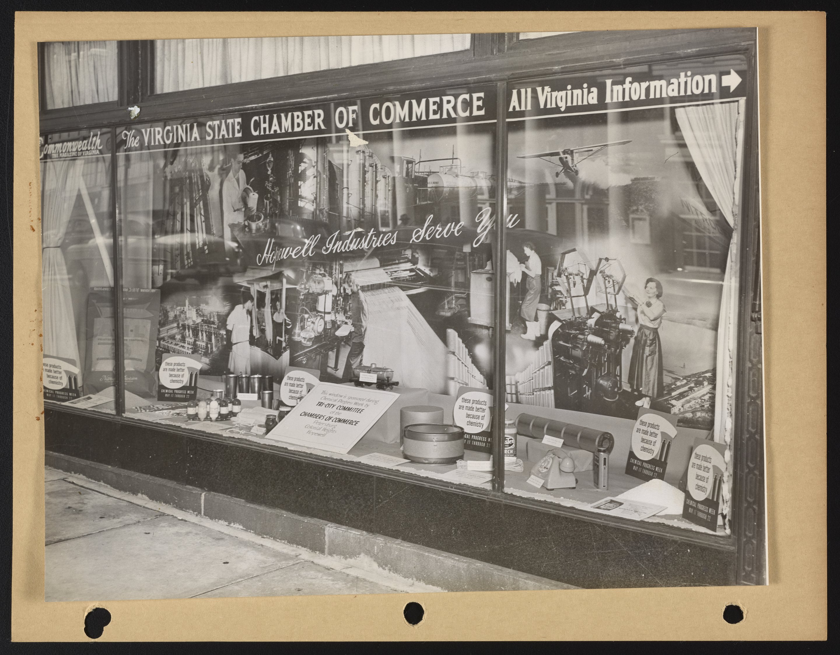 General view of the Virginia State Chamber of Commerce exhibition display celebrating Chemical Progress Week. The display includes photographs from the Hercules Powder Company facility in Hopewell, Virginia alongside samples of products "made better because of chemistry."