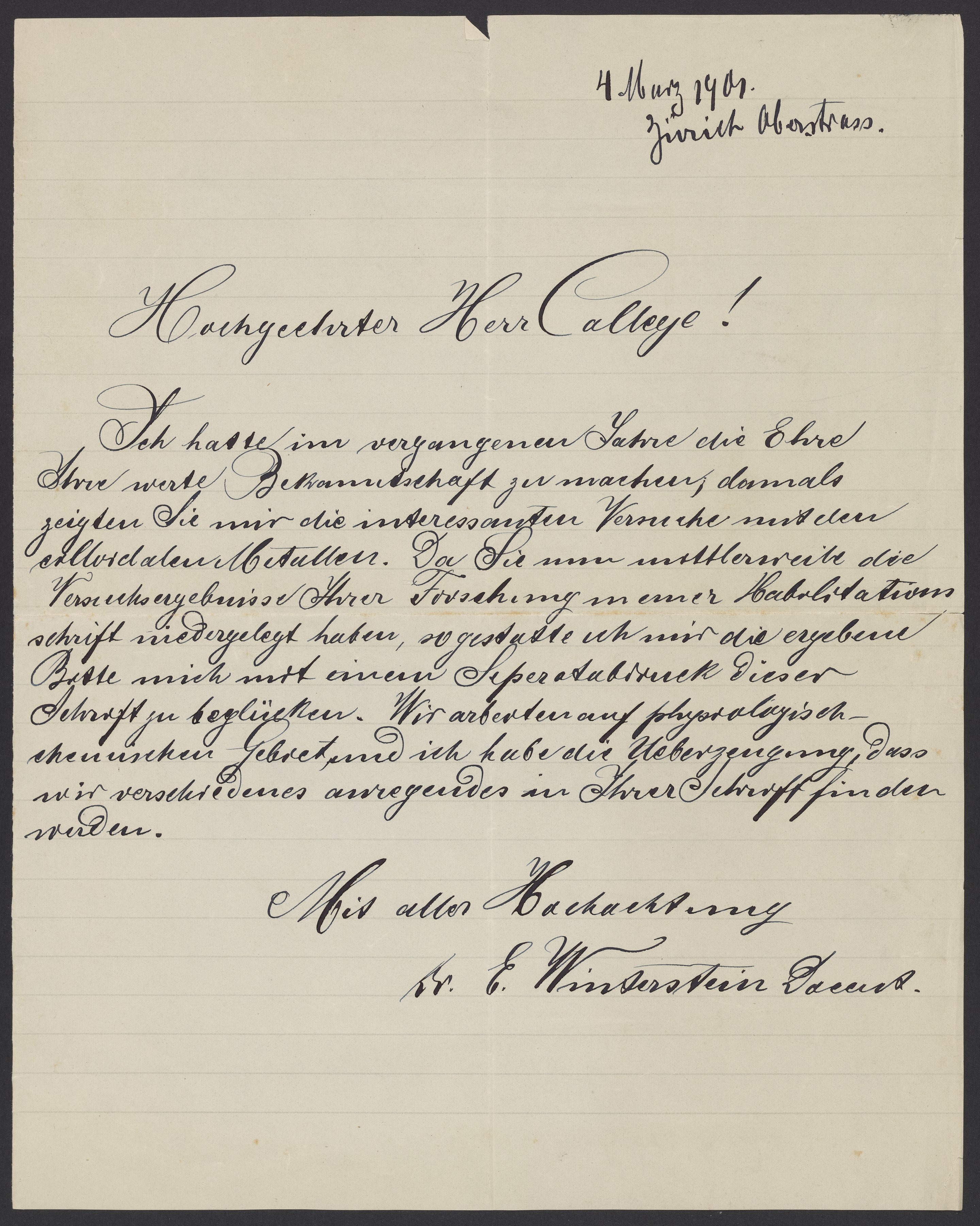 Winterstein, Ernst. “Letter from Ernst Winterstein to Georg Bredig, March 1904,” March 4, 1904. Papers of Georg and Max Bredig, Box 2, Folder 27. Science History Institute. Philadelphia. https://digital.sciencehistory.org/works/1gkr8n6.