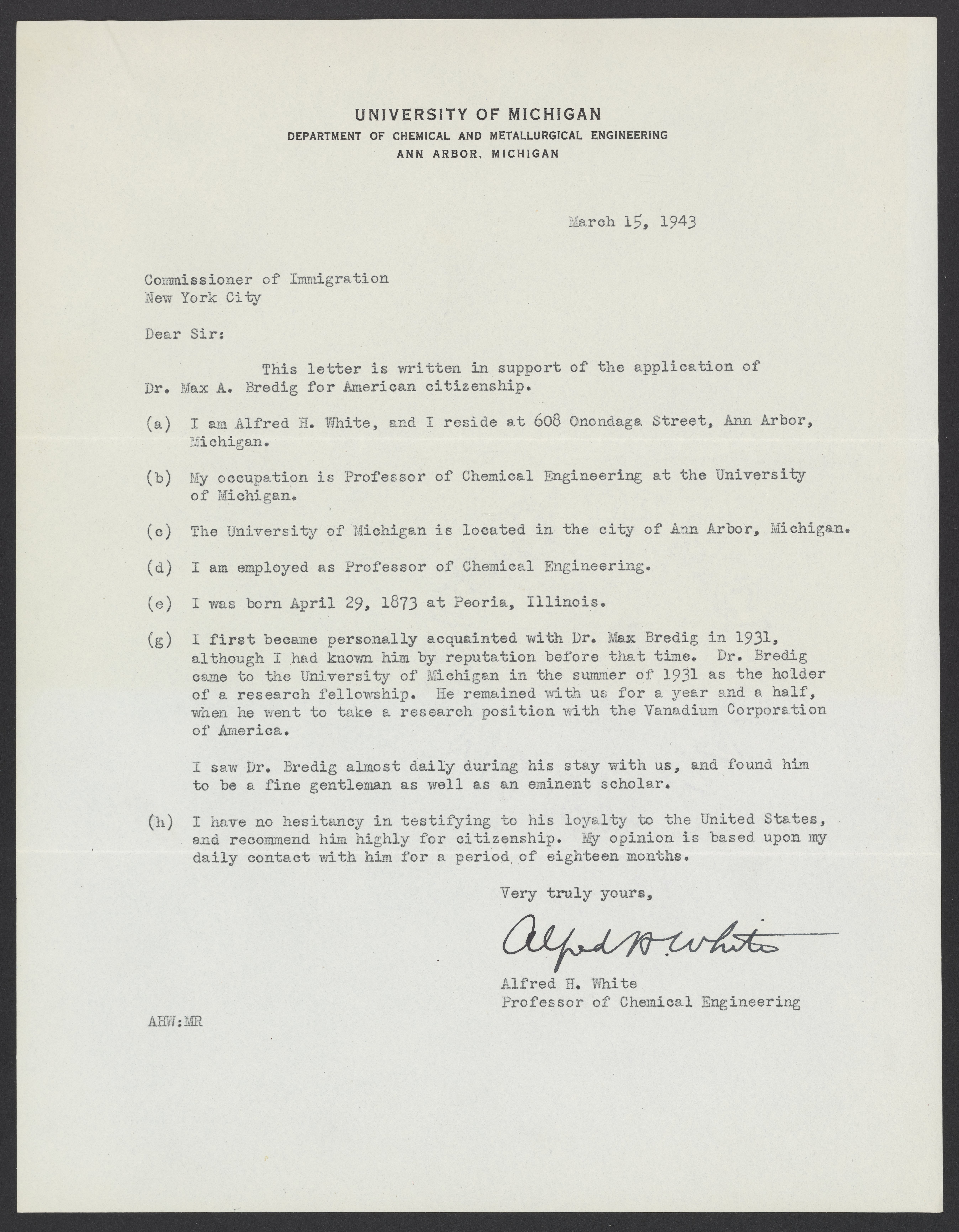 Testimony from Alfred H. White to the Commissioner of Immigration, March 15, 1943