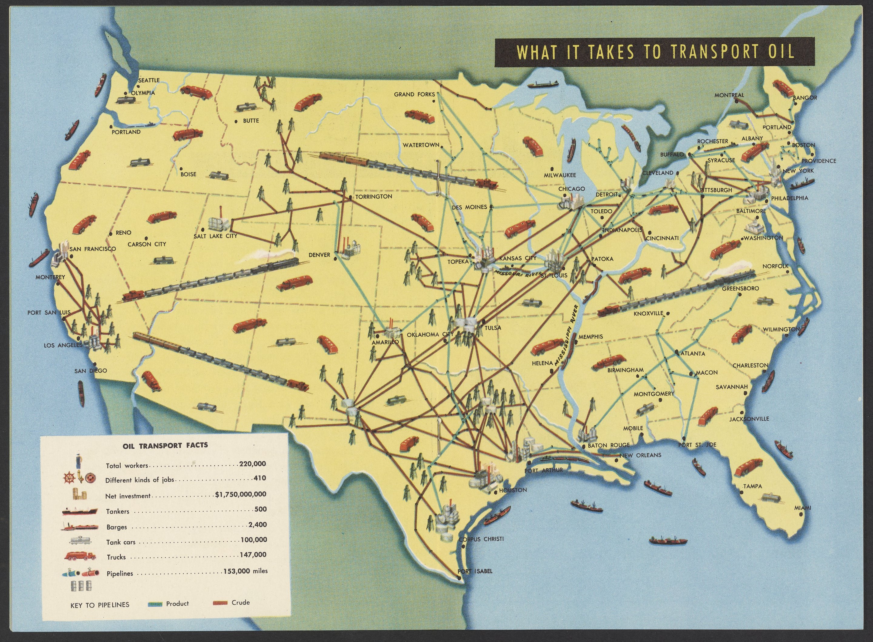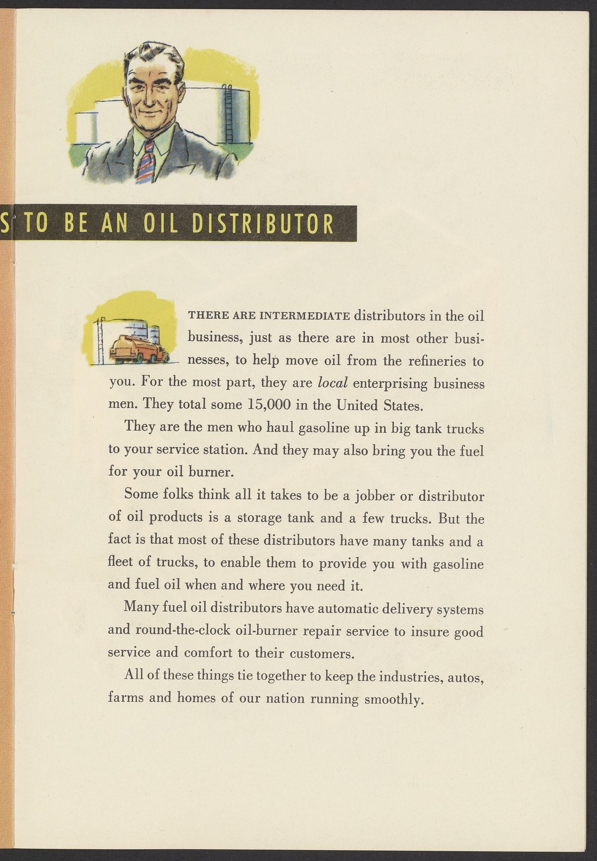 Small JPG1200 x 1738px — 442 KBFull-sized JPG2502 x 3624px — 2.8 MBOriginal fileTIFF — 2502 x 3624px — 25.9 MBIllustrated colorfully, this pamphlet describes how the production of oil positively affects daily American life and propagandizes the use of oil. Oil production is described sequentially: digging wells, refining, transporting, distributing, and running service stations.