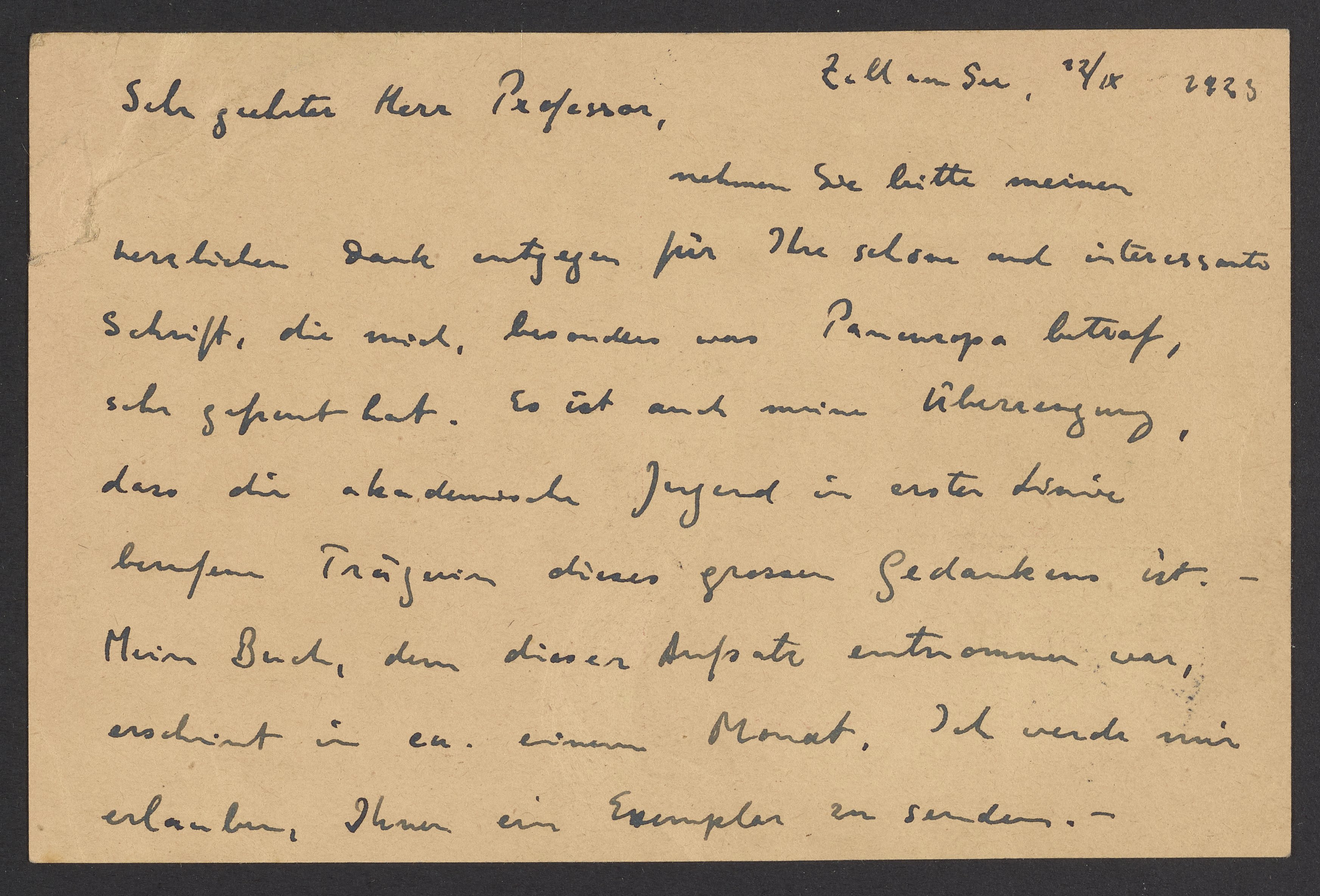 Nehmen Sie bitte meinen herzlichen Dank entgegen für Ihre sehr schöne und interessante Schrift, die mich, besonders was Paneuropa betraf, sehr gefreut hat. Es ist auch meine Überzeugung, dass die akademische Jugend in erster Linie berufene Träger dieses grossen Gedankens ist. Mein Buch, dem dieser Aufsatz entnommen war, erscheint in en. in einem Monat. Ich werde mir erlauben, Ihnen ein Exemplar zu senden.