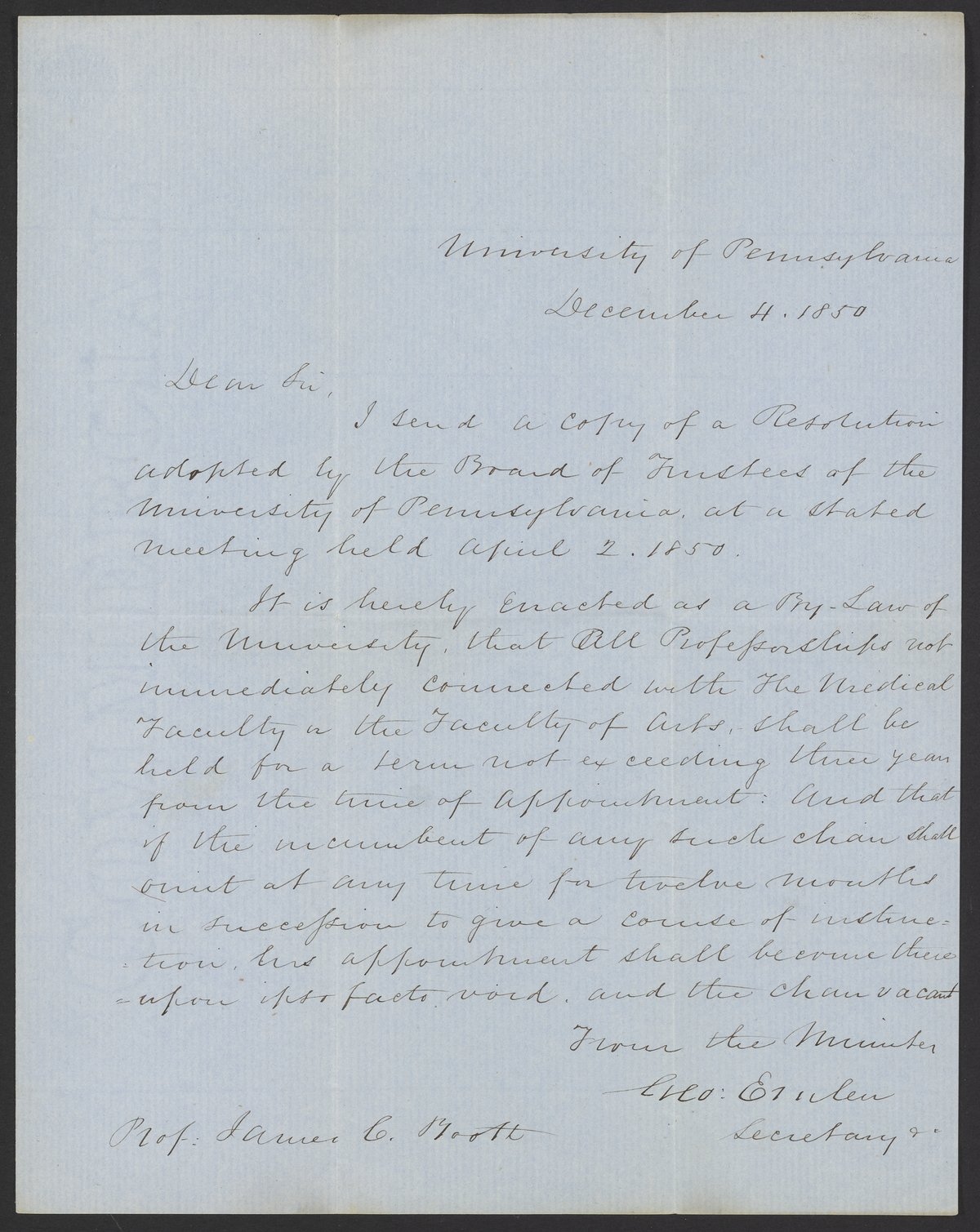 Emlen, G. “Letter from G. Emlen, Secretary of the University of Pennsylvania to James Curtis Booth,” December 4, 1850. Papers of James Curtis Booth, Box 1, Folder 6. Science History Institute. Philadelphia. https://digital.sciencehistory.org/works/1h48jlq.