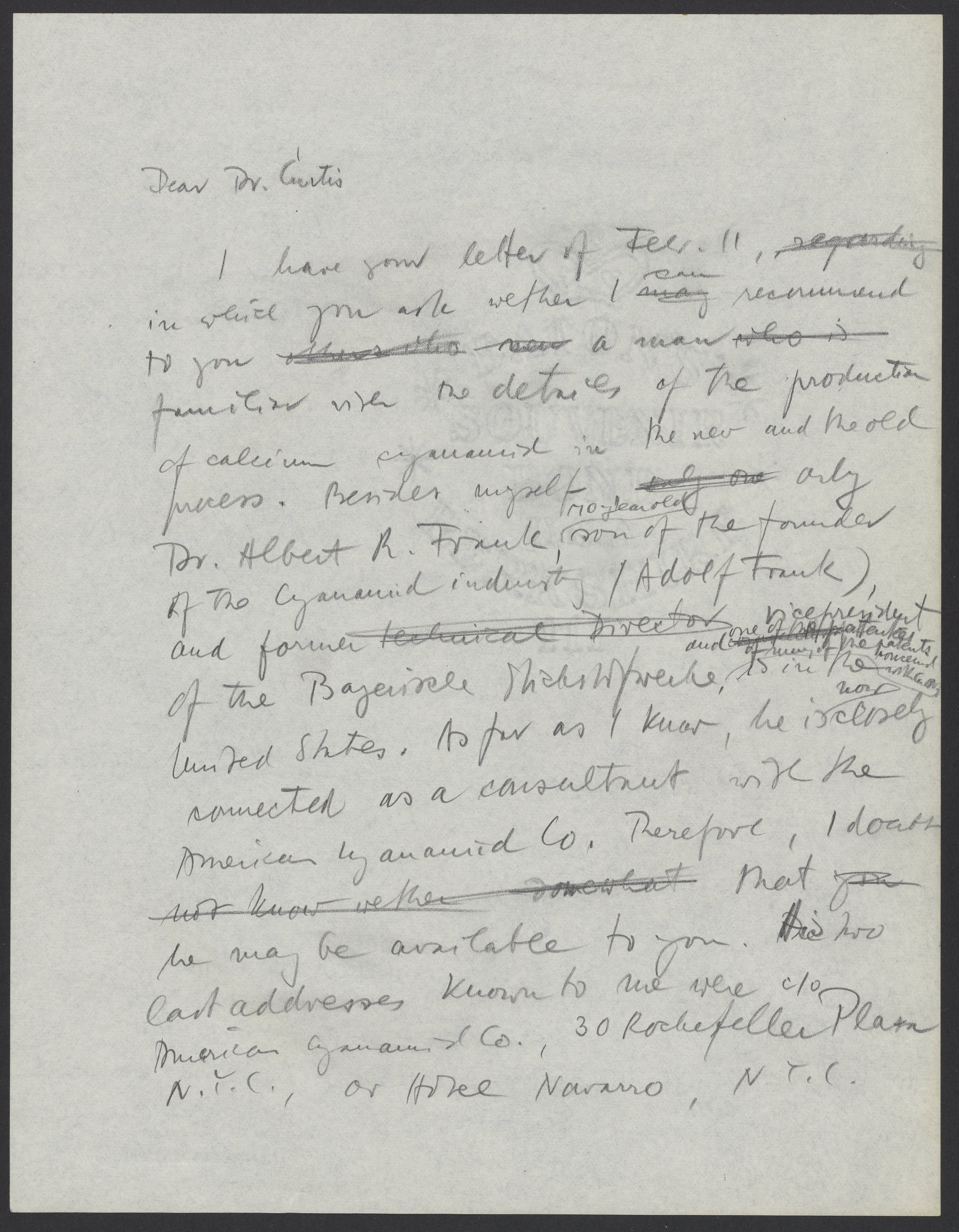 Small JPG1200 x 1537px — 329 KBLarge JPG2880 x 3689px — 2.0 MBFull-sized JPG5386 x 6899px — 6.8 MBOriginal fileTIFF — 5386 x 6899px — 106 MBMax Bredig (1902-1977) responds to Francis J. Curtis, development director of Monsanto Chemical Company, with a list of scientists who are familiar with calcium cyanimide production. Bredig strongly recommends his colleague Fritz Hochwald (1897-1968), and implies that an investment in Hochwald by Monsanto would expedite his release from the Miranda de Ebro internment camp and subsequent immigration to the United States.