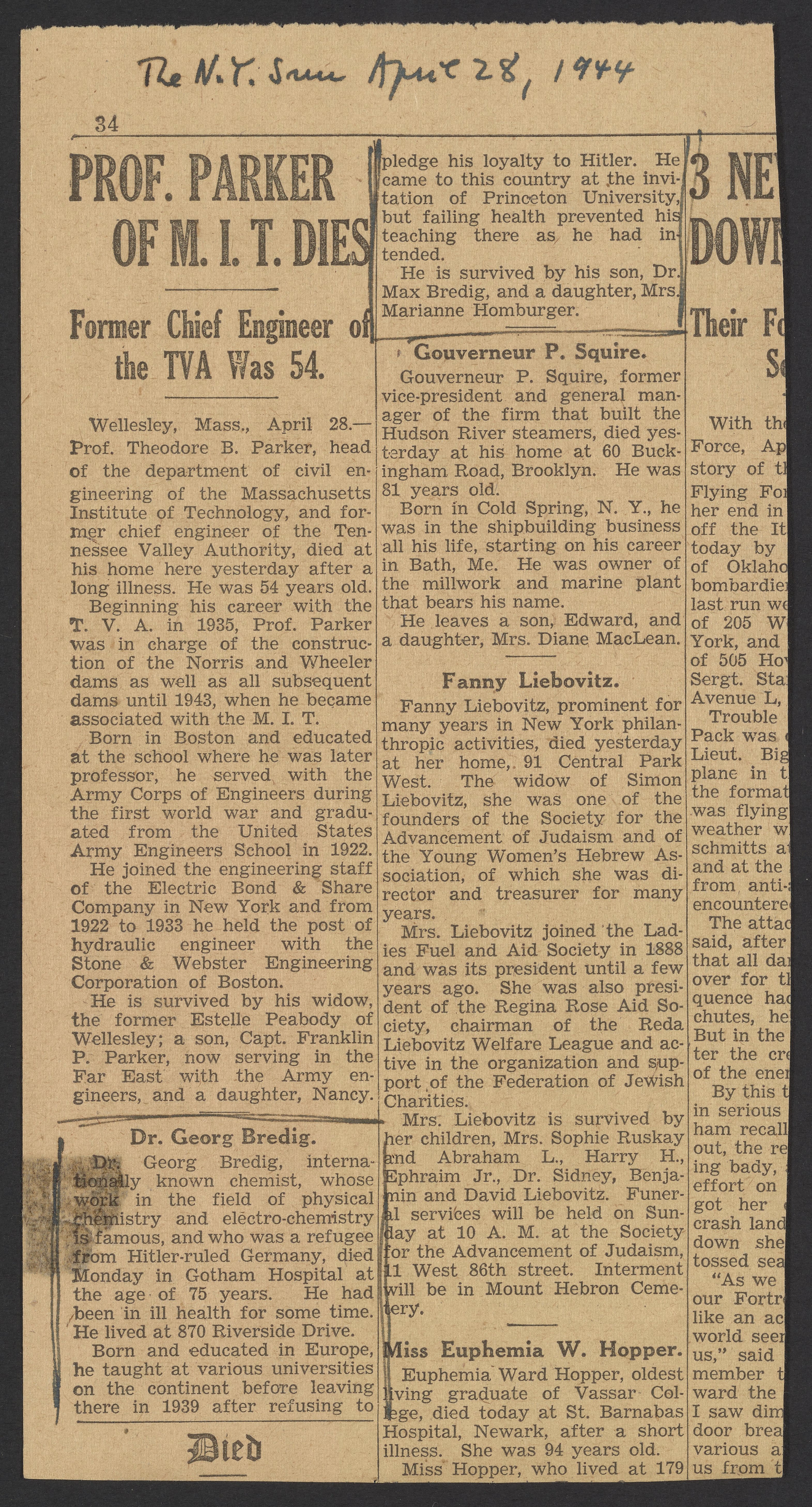 “New York Sun Obituary for Georg Bredig.” The New York Sun, April 28, 1944. Papers of Georg and Max Bredig, Box 3, Folder 15. Science History Institute. Philadelphia. https://digital.sciencehistory.org/works/1j659mk.