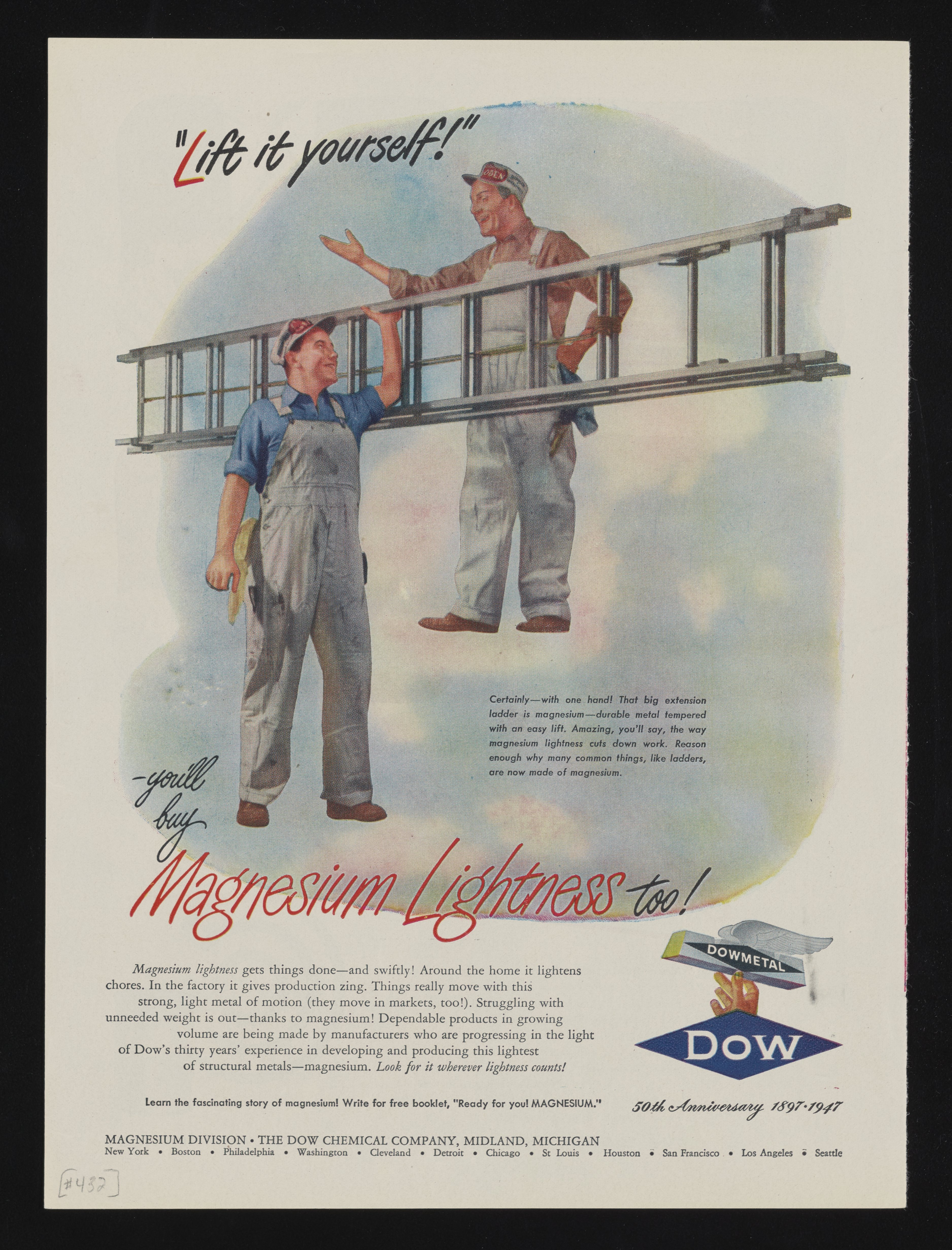 Color print advertisement for Dowmetal, a magnesium alloy manufactured and sold by the Dow Chemical Company. Depicts two men dressed in overalls, one holding a large ladder with one arm to demonstrate how lightweight materials manufactured with magnesium are.