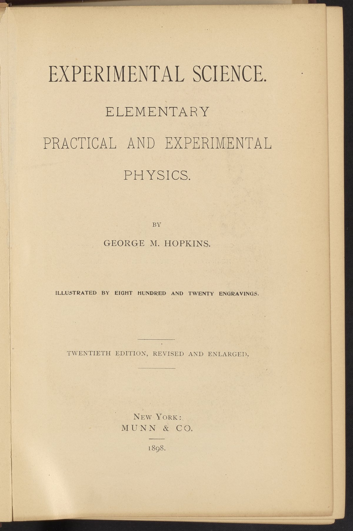 Hopkins, George M. (George Milton). “Experimental Science : Elementary, Practical and Experimental Physics.” New York, New York: Munn & Co. (New York, N.Y.), 1898. QC21 .H67 1898. Science History Institute. Philadelphia. https://digital.sciencehistory.org/works/1jq6i28.