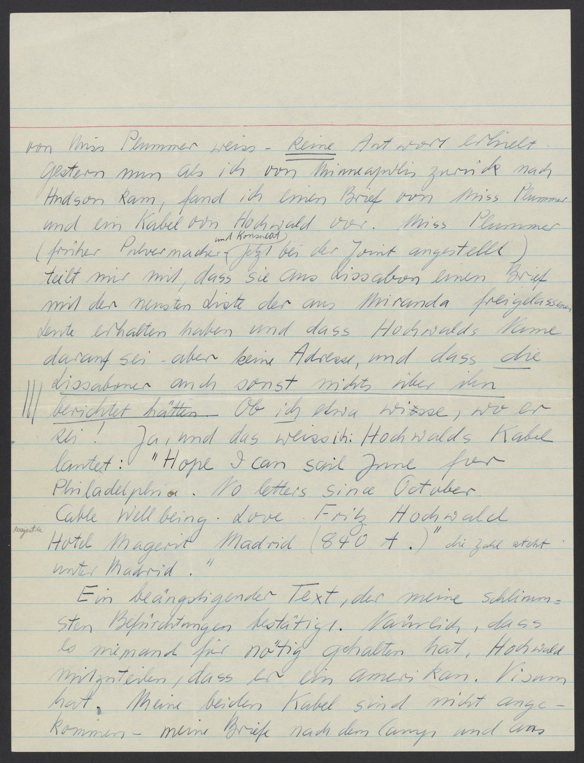 von Miss Plummer weiss – keine Antwort erhielt gestern man als ich von Minneapolis zurück nach Hudson kam, fand ich einen Brief von Miss Plummer und ein Kabel von Hochwald vor. Miss Plummer (früher Pulvermacher – jetzt bei der Joint angestellt) teilt mir mit, dass sie aus Lissabon einen Brief mit der neuesten Liste der aus Miranda freigelassenen Leute erhalten haben und dass Hochwalds Name darauf sei – aber keine Adresse, und dass die Lissaboner auch sonst nichts über ihn berichtet hätten. Ob ich etwa wisse, wo er sei! Ja, und das weiss ich: Hochwalds Kabel lautet: "Hope I can sail June for Philadelphia. No letters since October. Cable well-being. Love Fritz Hochwald. Hotel Magerit Madrid (840 A.)" Die Zeit steht unter Madrid.
