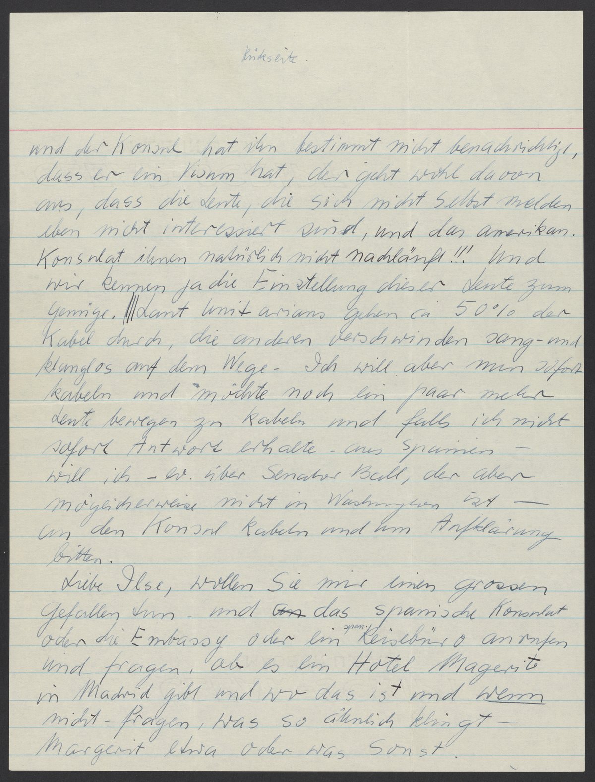 und der Konsul hat ihn bestimmt nicht benachrichtigt, dass er ein Visum hat, der geht wohl davon aus, dass die Leute, die sich nicht selbst melden, eben nicht interessiert sind, und das amerikanisch. Konsulat ihnen natürlich nicht nachläßt!!! Und wir kennen ja die Einstellung dieser Leute zum Genüge. Laut Unitarians gehen ca 50% der Kabel durch, die anderen verschwinden sang-und klanglos auf dem Wege. Ich will aber nun sofort kabeln und möchte noch ein paar mehr Leute bewegen zu kabeln und falls ich nicht sofort Antwort erhalte – aus Spanien – will ich ev. über Senator Ball, der aber möglicherweise nicht in Washington ist – um den Konsul Kabeln und um Aufklärung bitten.