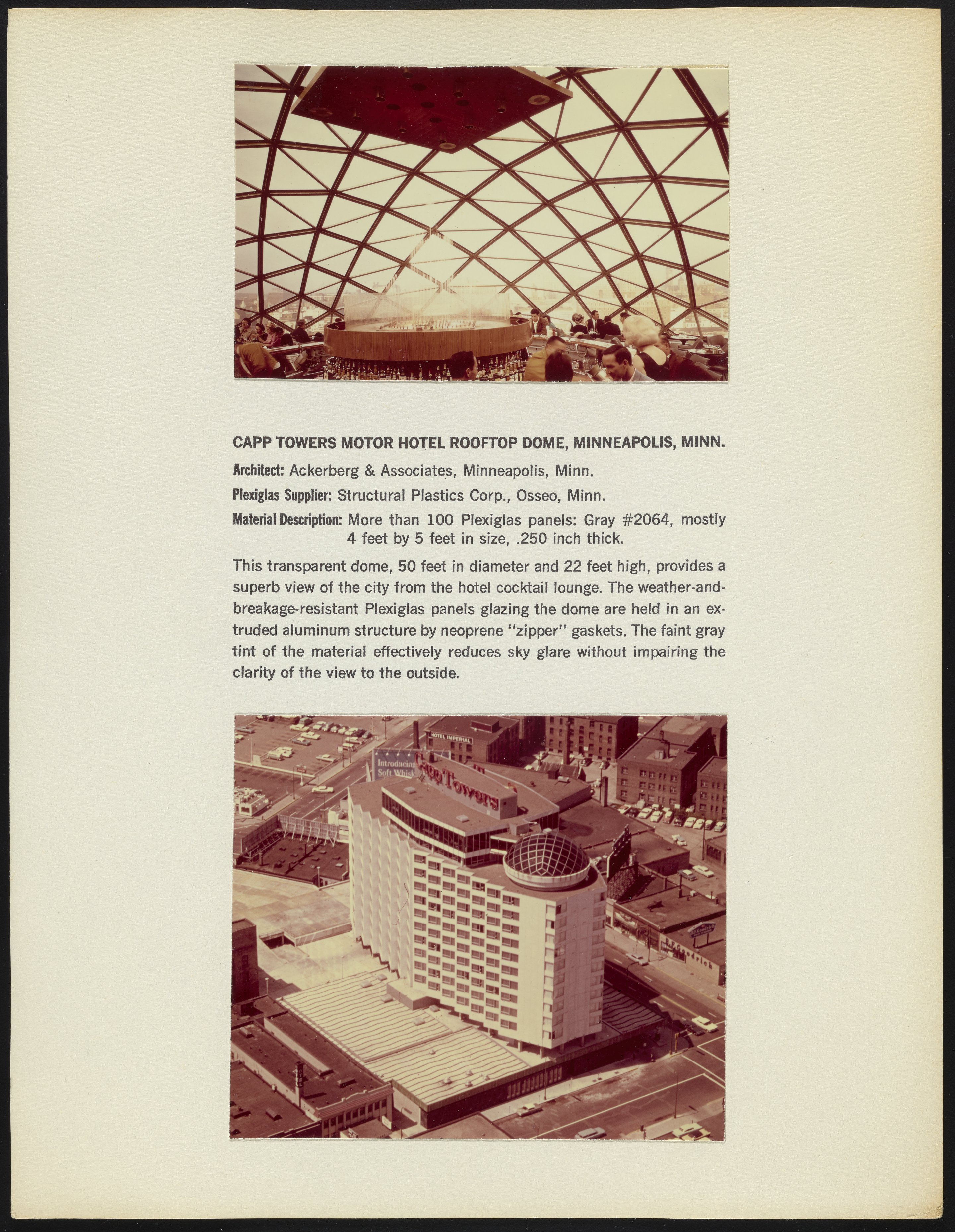 Two photographs depicting the Capp Towers Motor Hotel Rooftop Dome located in Minneapolis, Minnesota, part of a series documenting the use of Plexiglas in the building industry. Per notations accompanying the photographs, the building was designed by architectural firm Ackerburg & Associates and features a transparent Plexiglas dome, 50 feet in diameter and 22 feet high, held in an extruded aluminum structure by neoprene "zipper" gaskets.