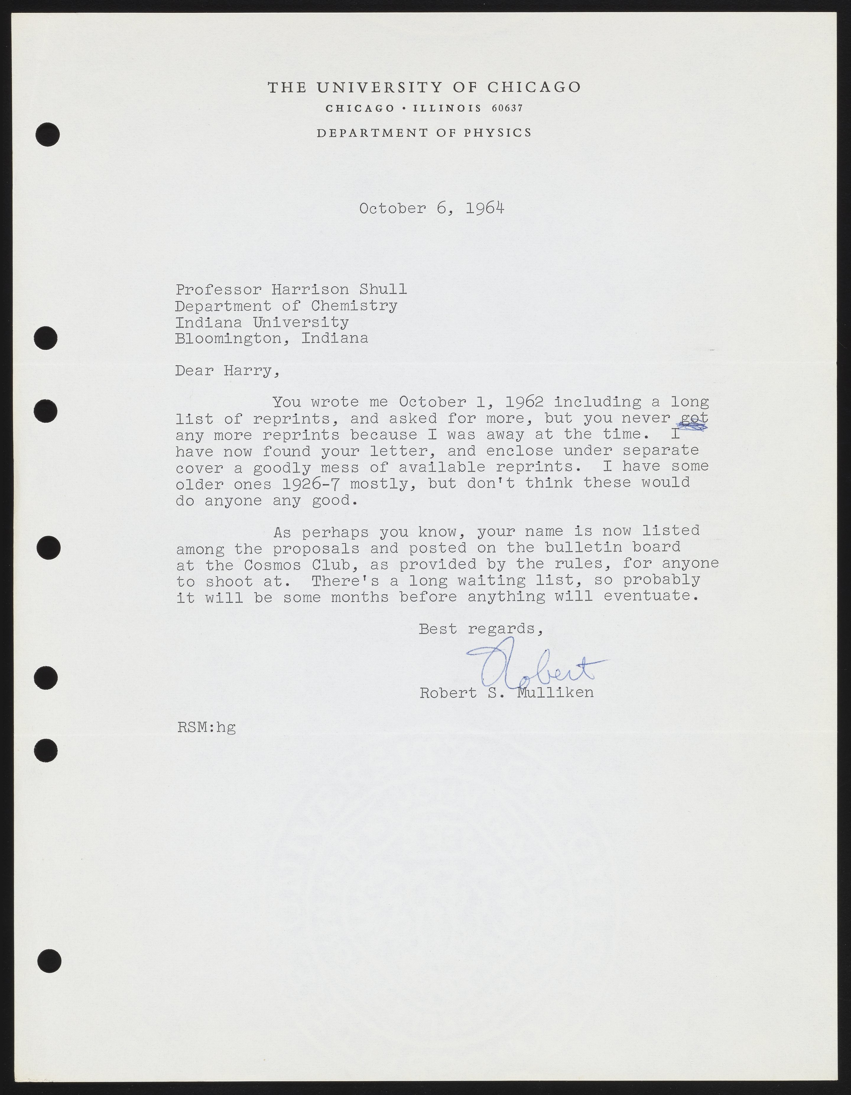 Letter from Robert S. Mulliken to Harrison Shull, 1964