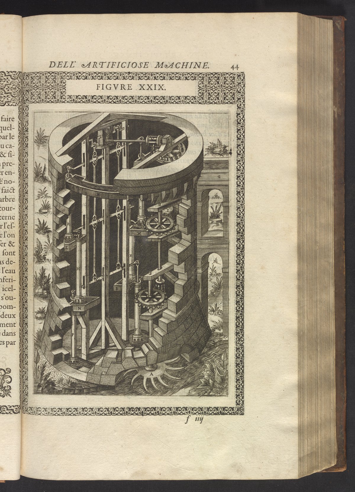 Ramelli, Agostino. “Plate 29: Device for Raising Water from a River, Pond, or Lake by River or Canal Current.” In Le Diverse Et Artificiose Machine Del Capitano Agostino Ramelli. Paris, France, 1588. https://digital.sciencehistory.org/works/1n79h4427.