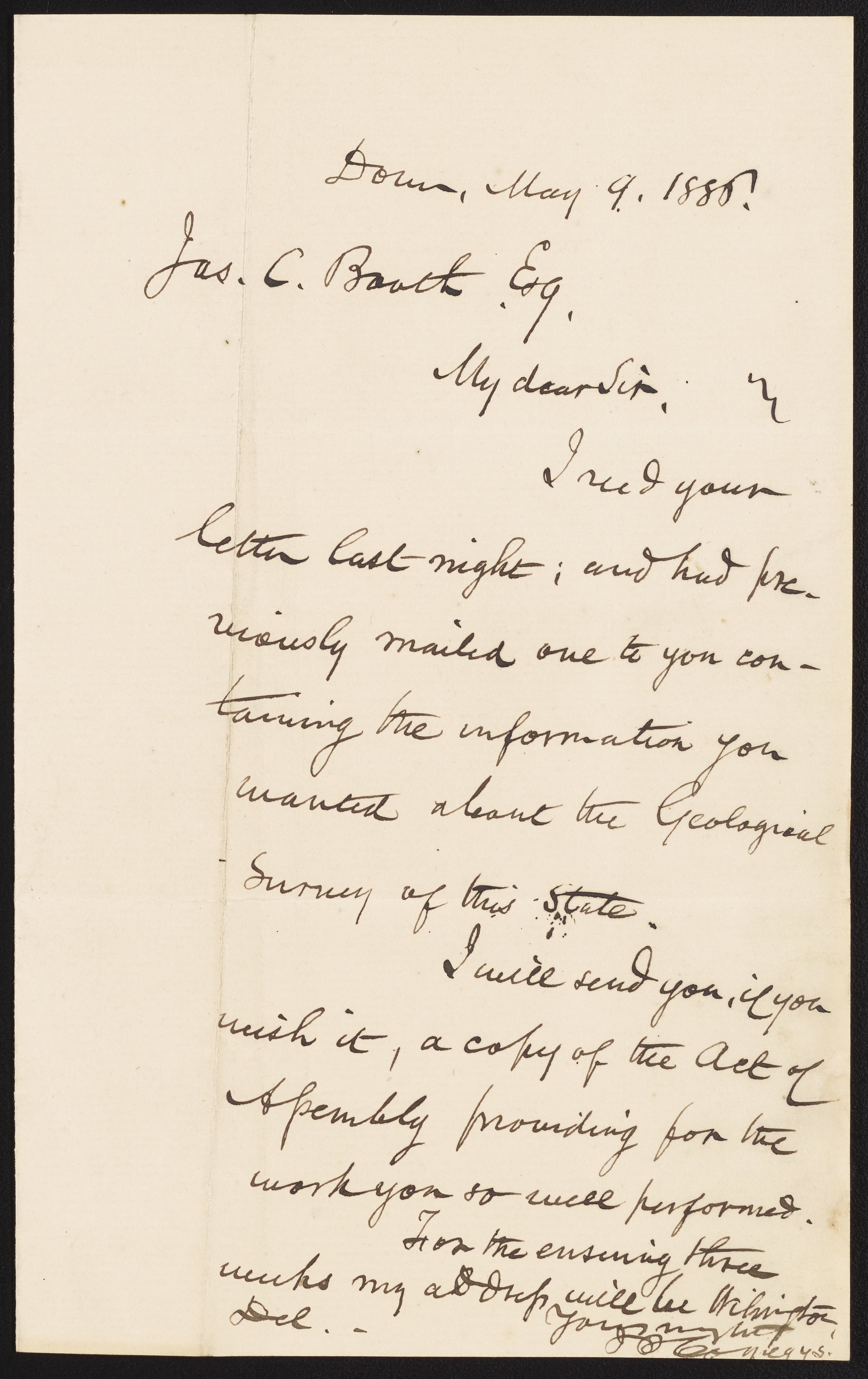 Comegys, Joseph P. (Joseph Parsons). “Letter from Joseph P. Comegys to James Curtis Booth, May 9, 1885,” May 9, 1885. Papers of James Curtis Booth, Box 2, Folder 7. Science History Institute. Philadelphia. https://digital.sciencehistory.org/works/1o4yzlk.