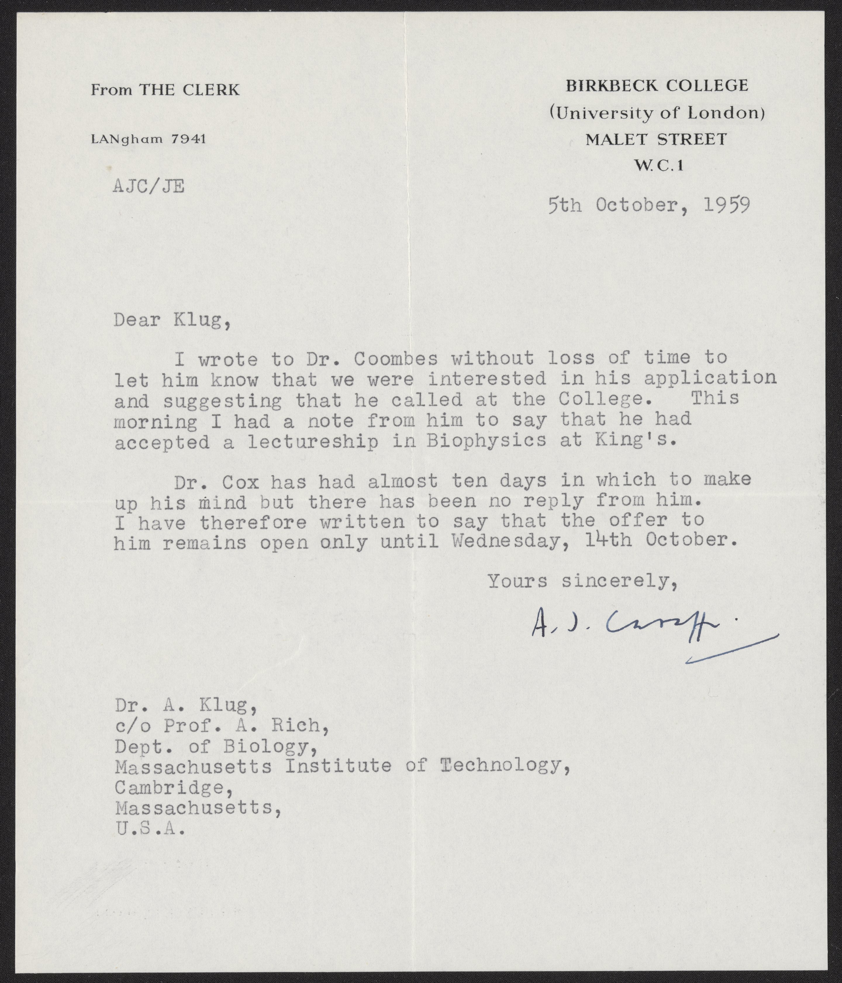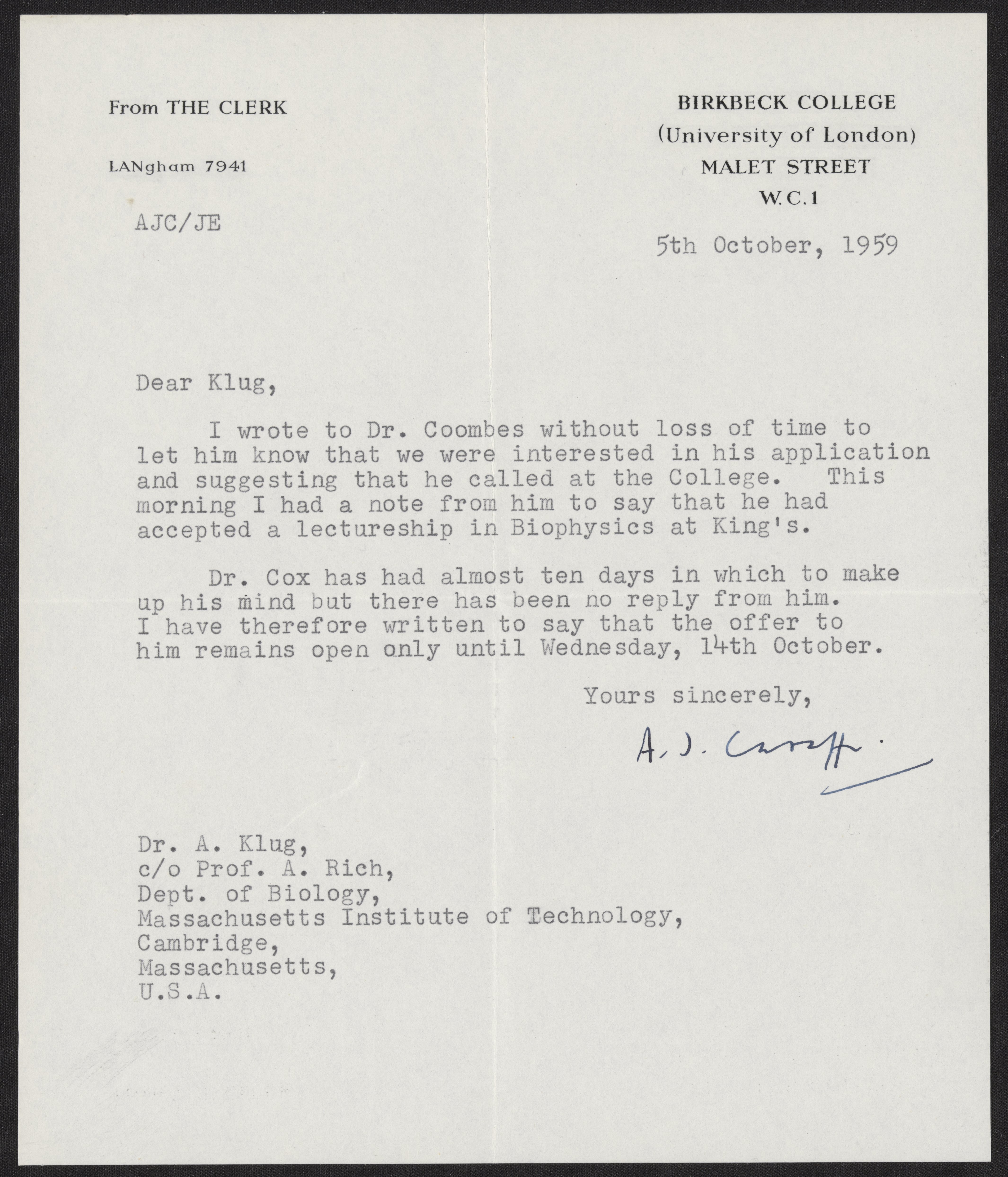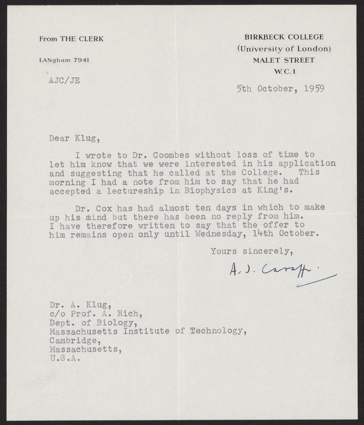 Letter from A. J. Caraffi to Aaron Klug, October 5, 1959
