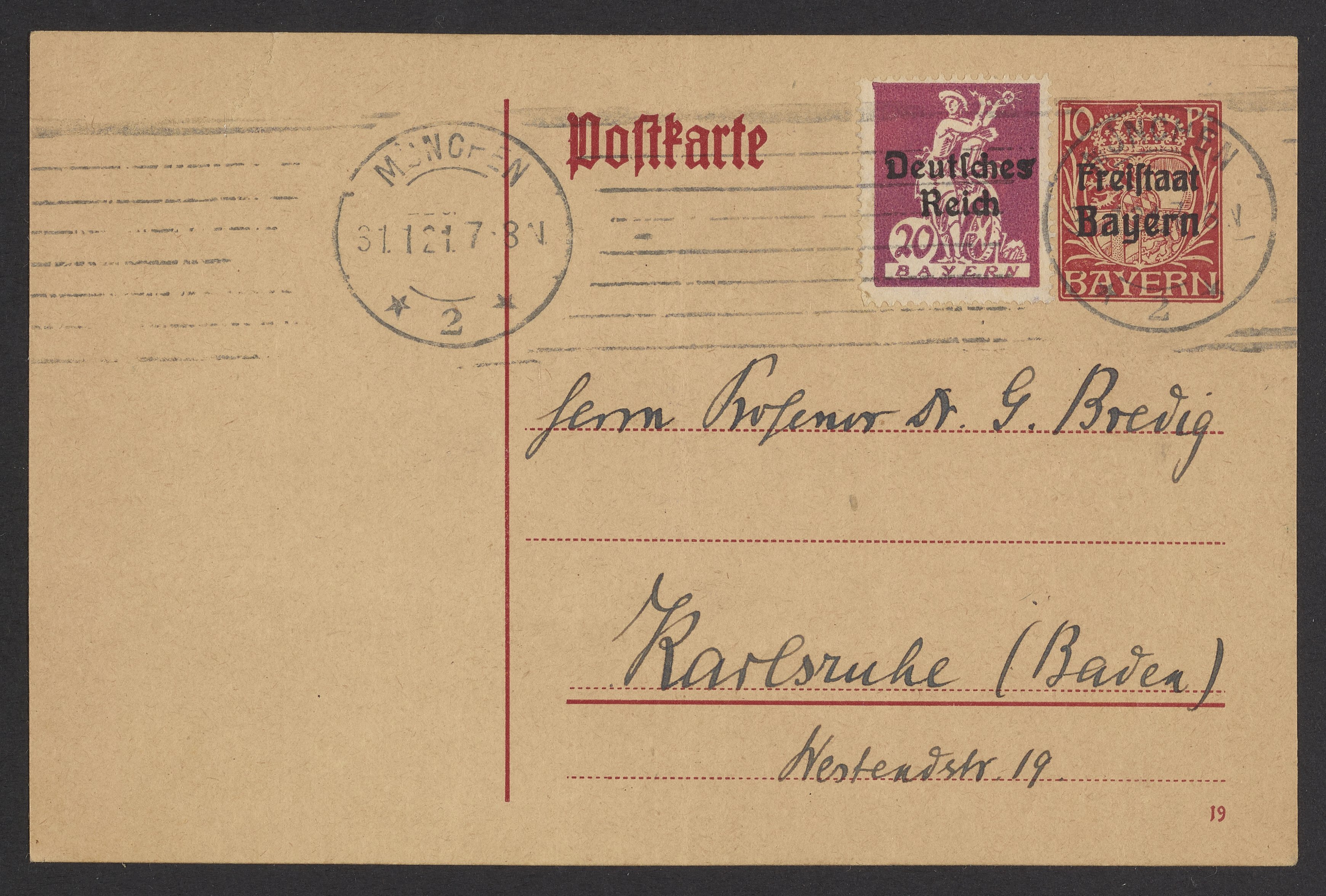 Willstätter, Richard. “Postcard from Richard Willstätter to Georg Bredig, January 1921,” January 30, 1921. Papers of Georg and Max Bredig, Box 2, Folder 28. Science History Institute. Philadelphia. https://digital.sciencehistory.org/works/1quqxwp.