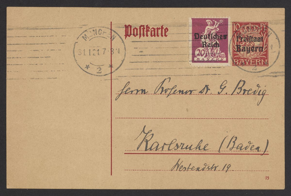 Postcard from Richard Willstätter to Georg Bredig, January 1921