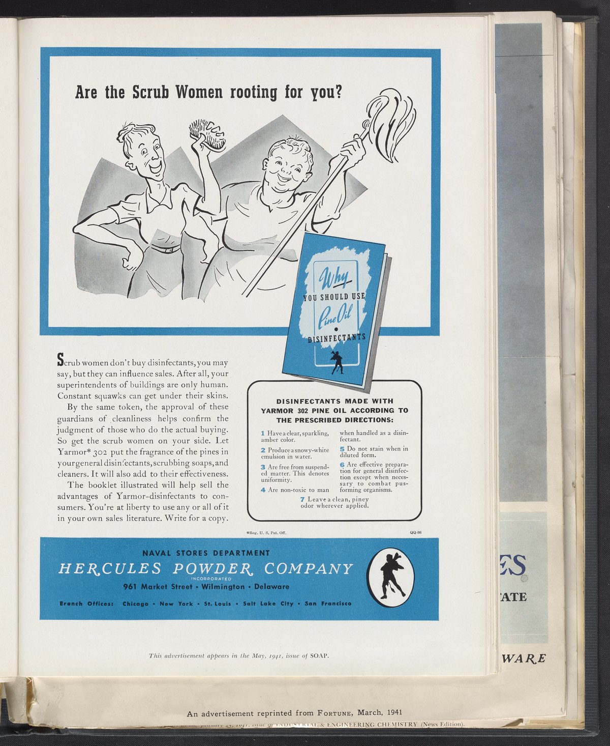 Hercules Incorporated. “Are the Scrub Women Rooting for You?” 1941 Hercules Advertisements, 1941. Records of Hercules Incorporated, Volume 1941. Science History Institute. Philadelphia. https://digital.sciencehistory.org/works/1r66j192p.