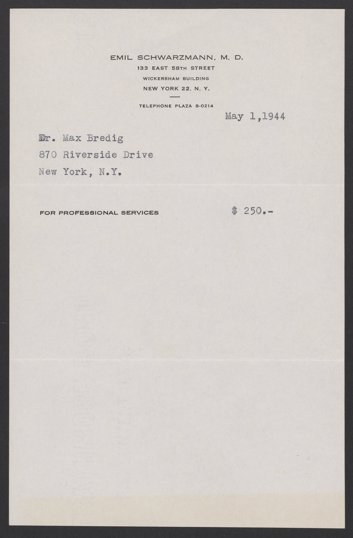 Gotham Hospital, and Emil Schwarzmann. “Medical Receipts,” 1944. Papers of Georg and Max Bredig, Box 10, Folder 15. Science History Institute. Philadelphia. https://digital.sciencehistory.org/works/1slgy2a.