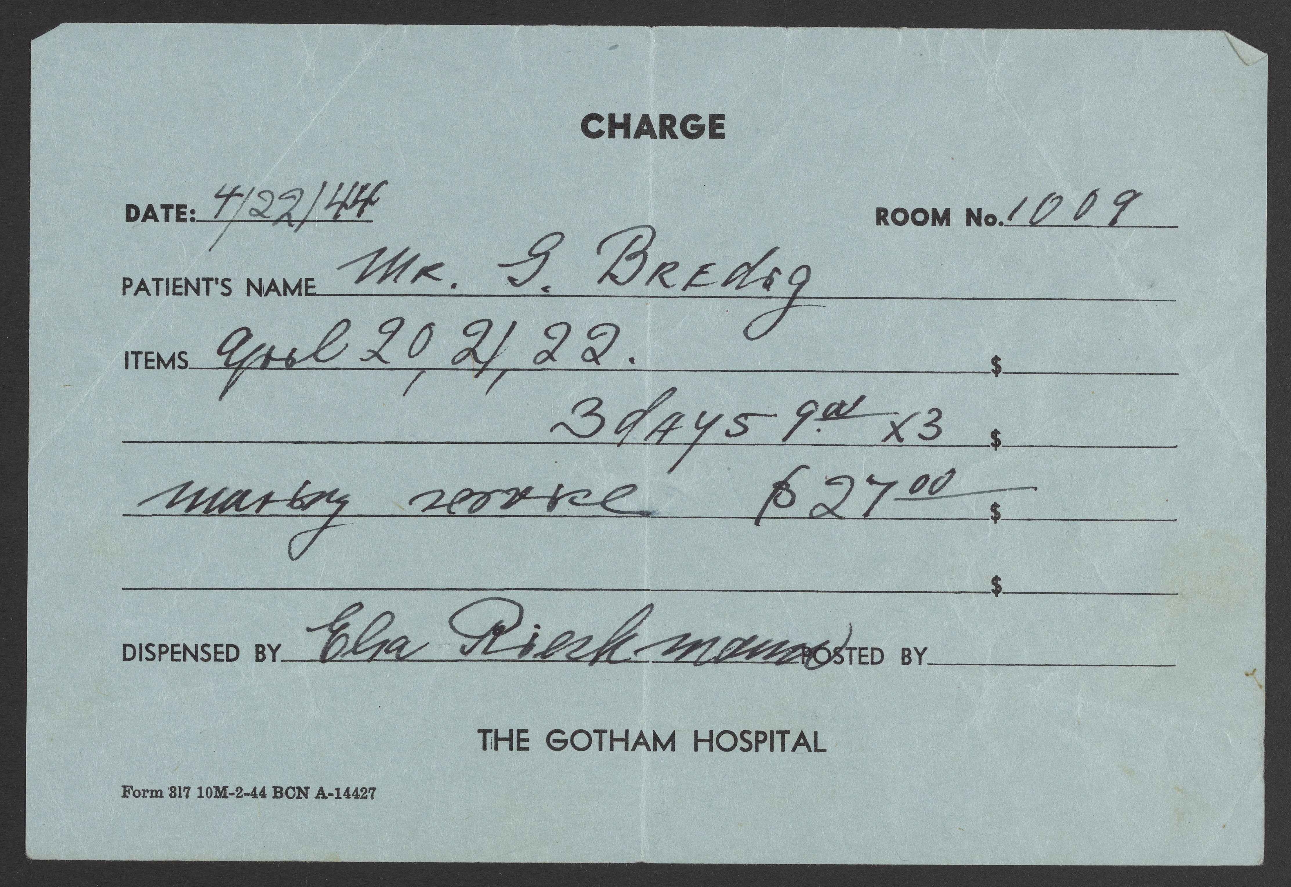 Gotham Hospital, and Emil Schwarzmann. “Medical Receipts,” 1944. Papers of Georg and Max Bredig, Box 10, Folder 15. Science History Institute. Philadelphia. https://digital.sciencehistory.org/works/1slgy2a.