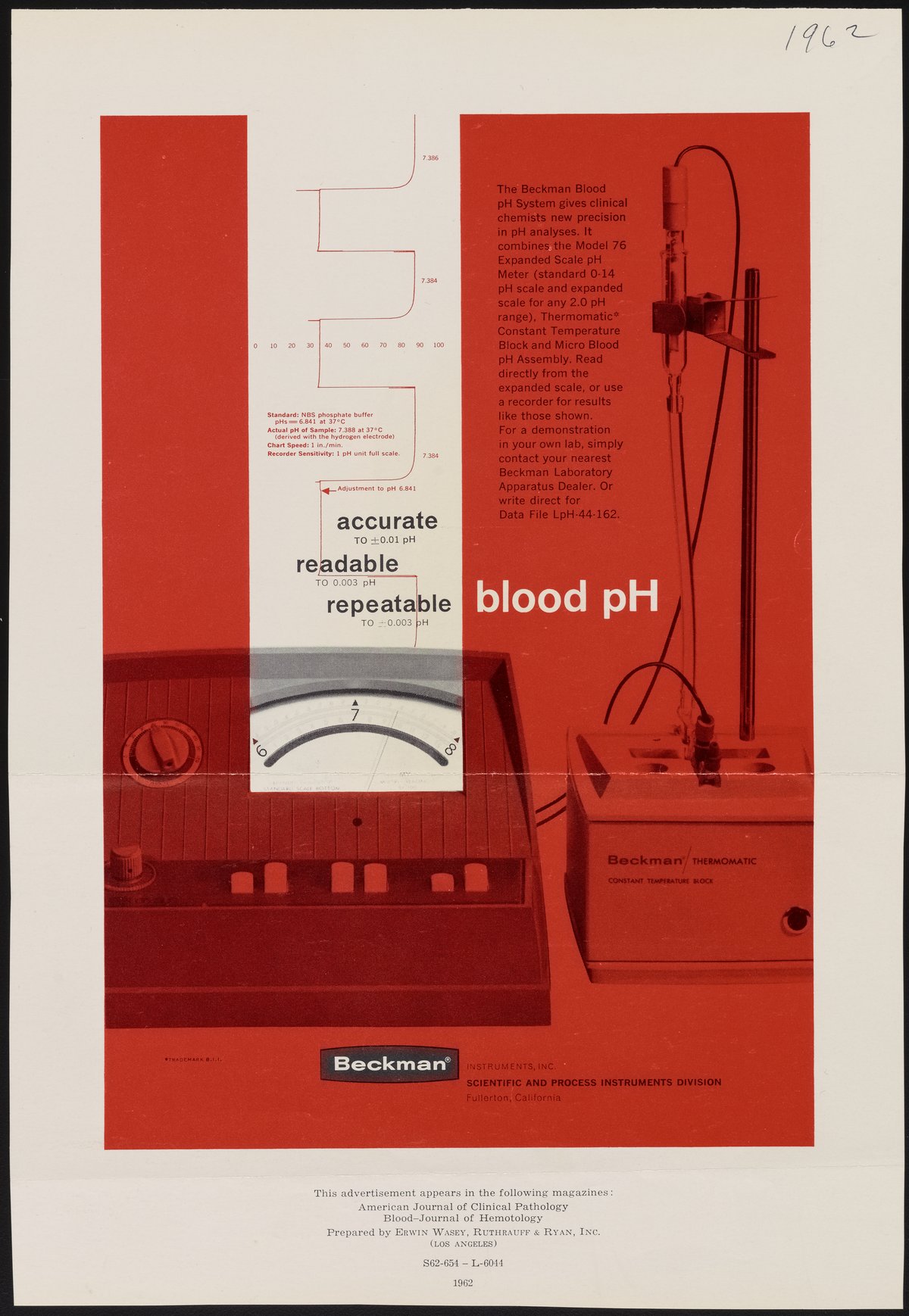 Beckman Instruments, Inc. “Accurate, Readable, Repeatable Blood PH,” 1962. Beckman Historical Collection, Box 49, Folder 20. Science History Institute. Philadelphia. https://digital.sciencehistory.org/works/1v53jw97x.