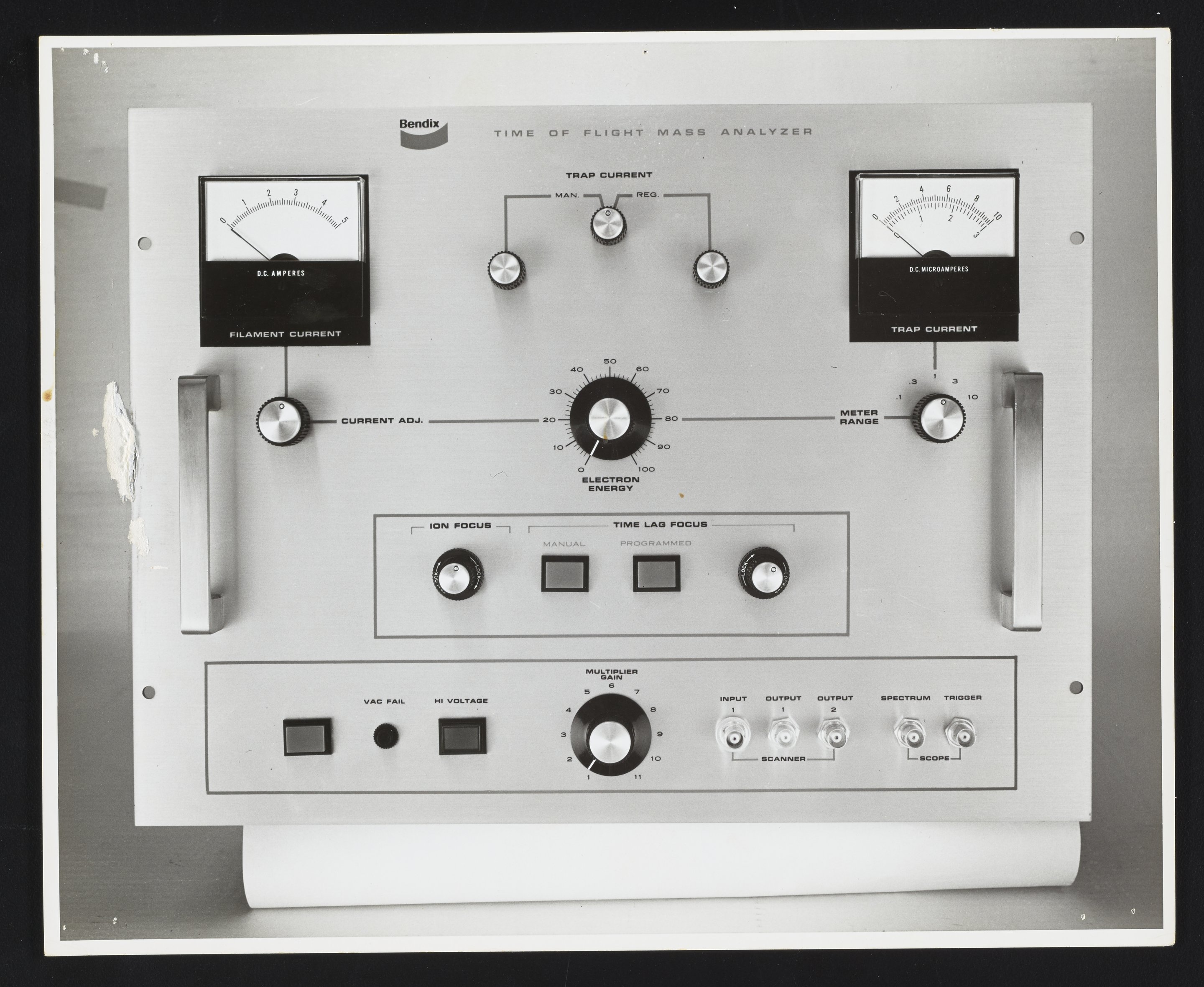 Close-up view of the control panel for a Bendix Corporation Time-of-Flight Mass Analyzer. One of four component parts of a mass spectrometer, the mass analyzer is used to separate the particles of a sample material according to mass for qualitative and quantitative analysis.