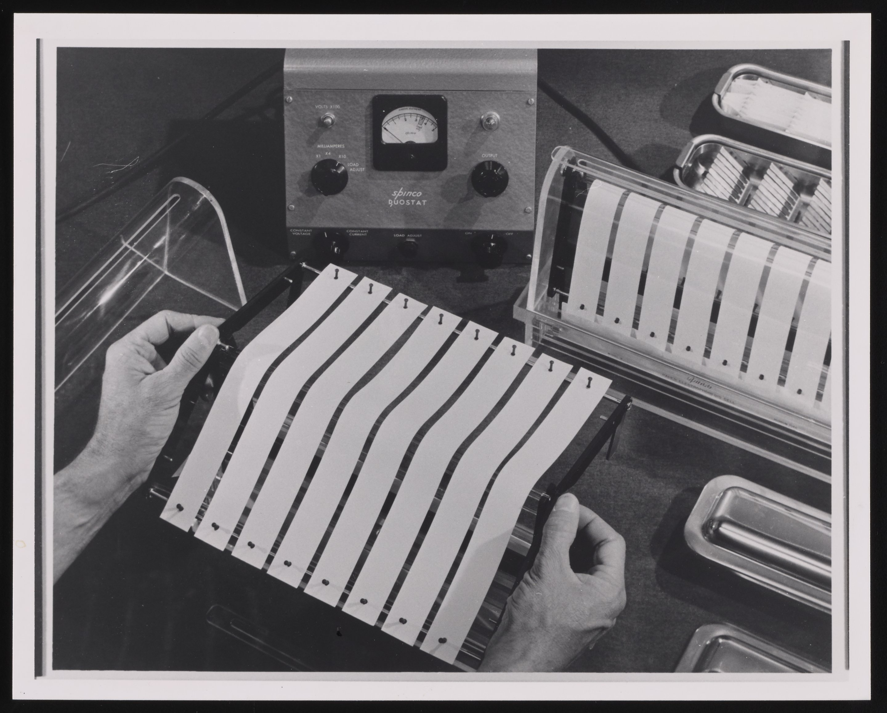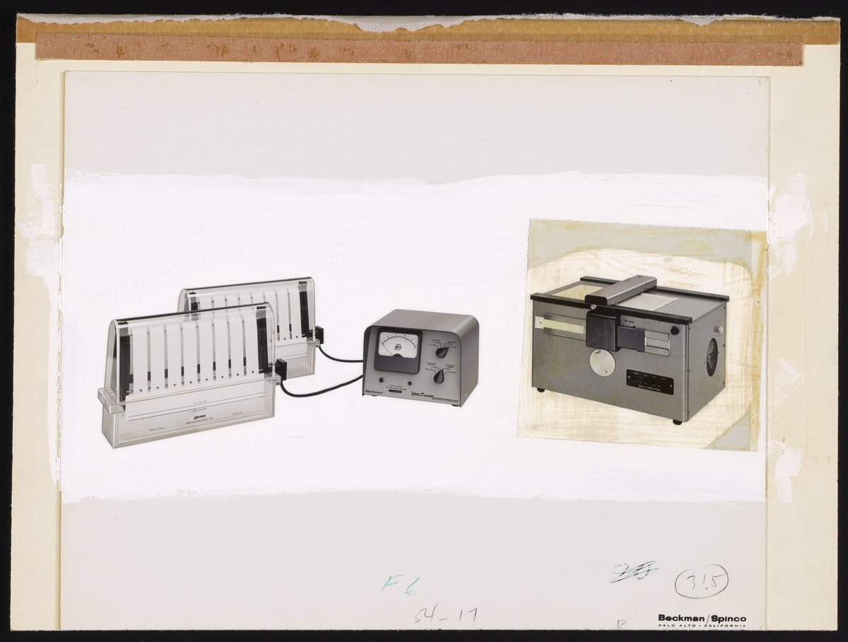 Illig, Russell. “Beckman Spinco Division Model R Paper Electrophoresis System,” 1963. Beckman Historical Collection, Box 60, Folder 1. Science History Institute. Philadelphia. https://digital.sciencehistory.org/works/1v53jx507.