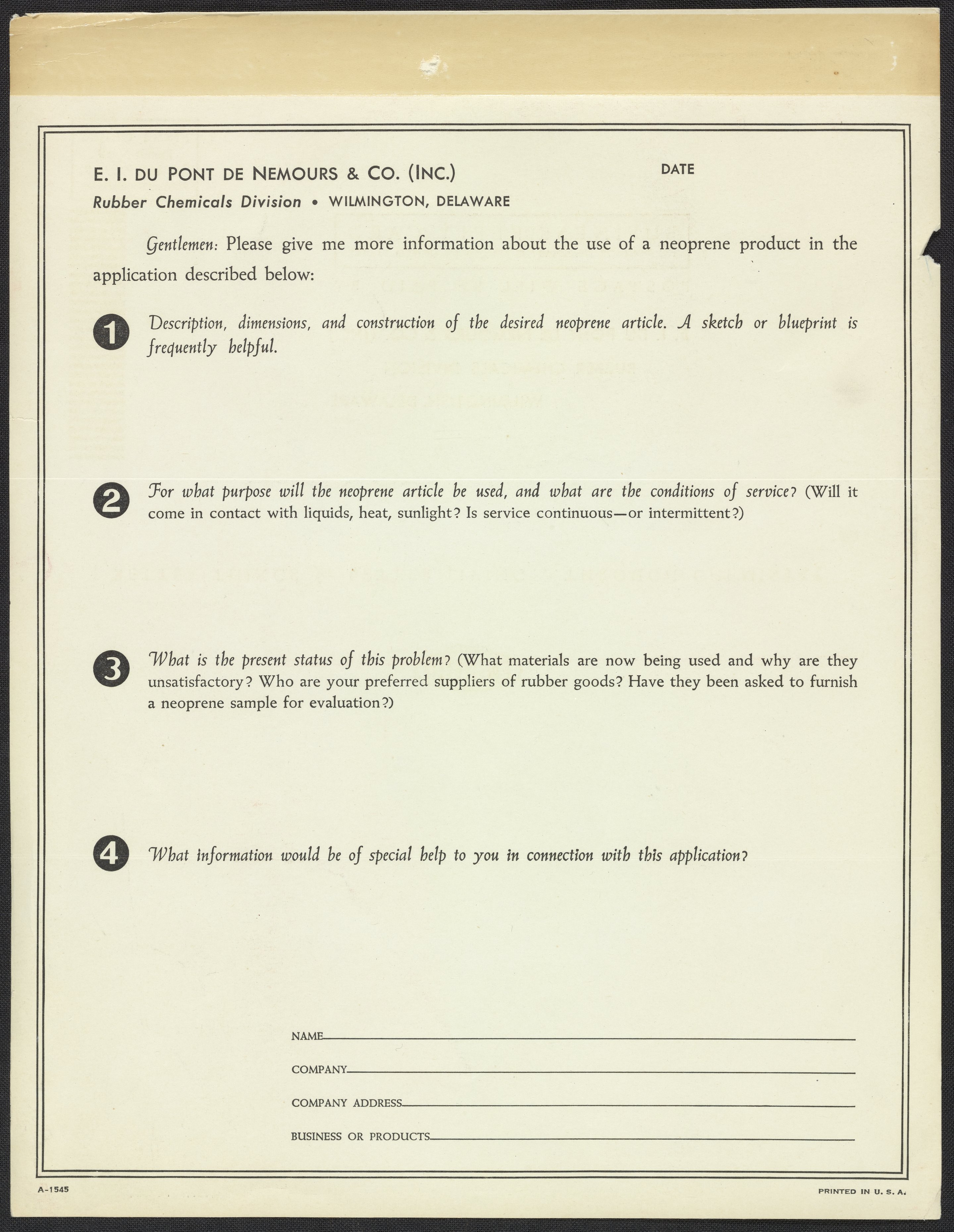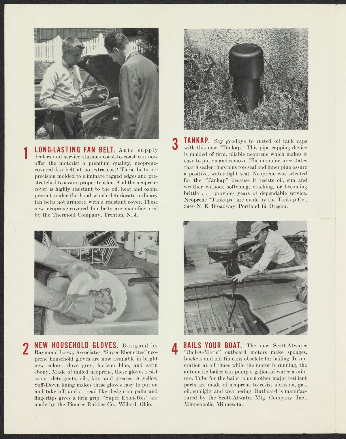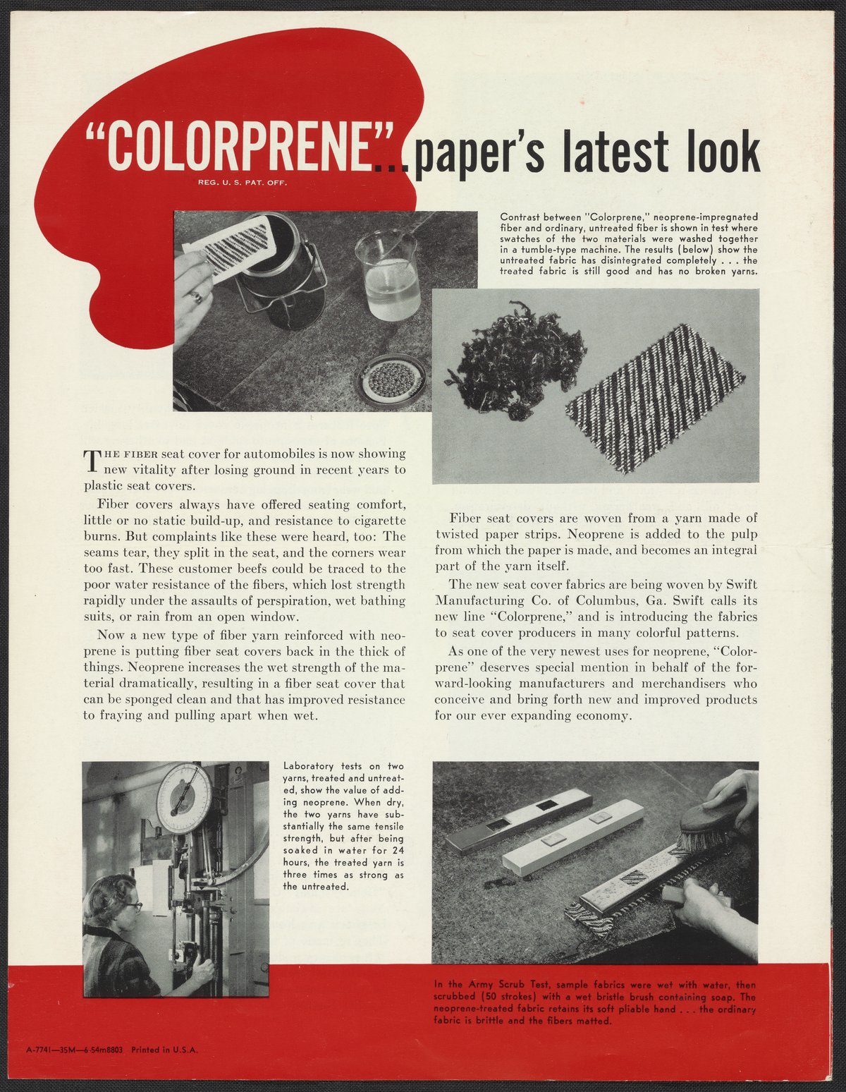 A brochure issued quarterly to a variety of manufacturing industries to highlight consumer products made with neoprene such as household gloves, auto fan belts, hunting boots, and garden hose covers. The back cover introduces Colorprene, a material made with fiber yarn reinforced with neoprene, and created with automobile seats as the main end product.