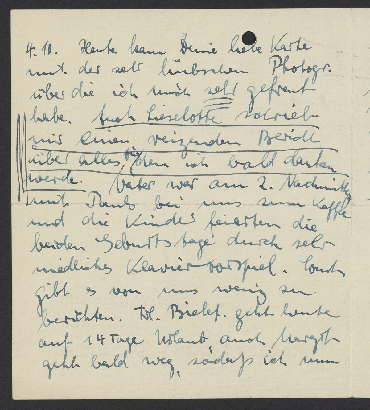 10.4. Heute kam Deine liebe Karte mit der sehr hübschen Photog. über die ich mich sehr gefreut habe. Auch Lieselotte schrieb mir einen reizenden Bericht über alles für den ich bald danken werde. Vater war am 2. Nachmittag mit Pauls bei uns zum Kaffee und die Kinder feierten die Geburtstage durch sehr niedliches Klavierspiel. Auch gibt es von uns wenig zu berichten. Frl. Bielef. geht heute auf 14 Tage Urlaub, auch Margot geht bald weg, sodaß ich nun