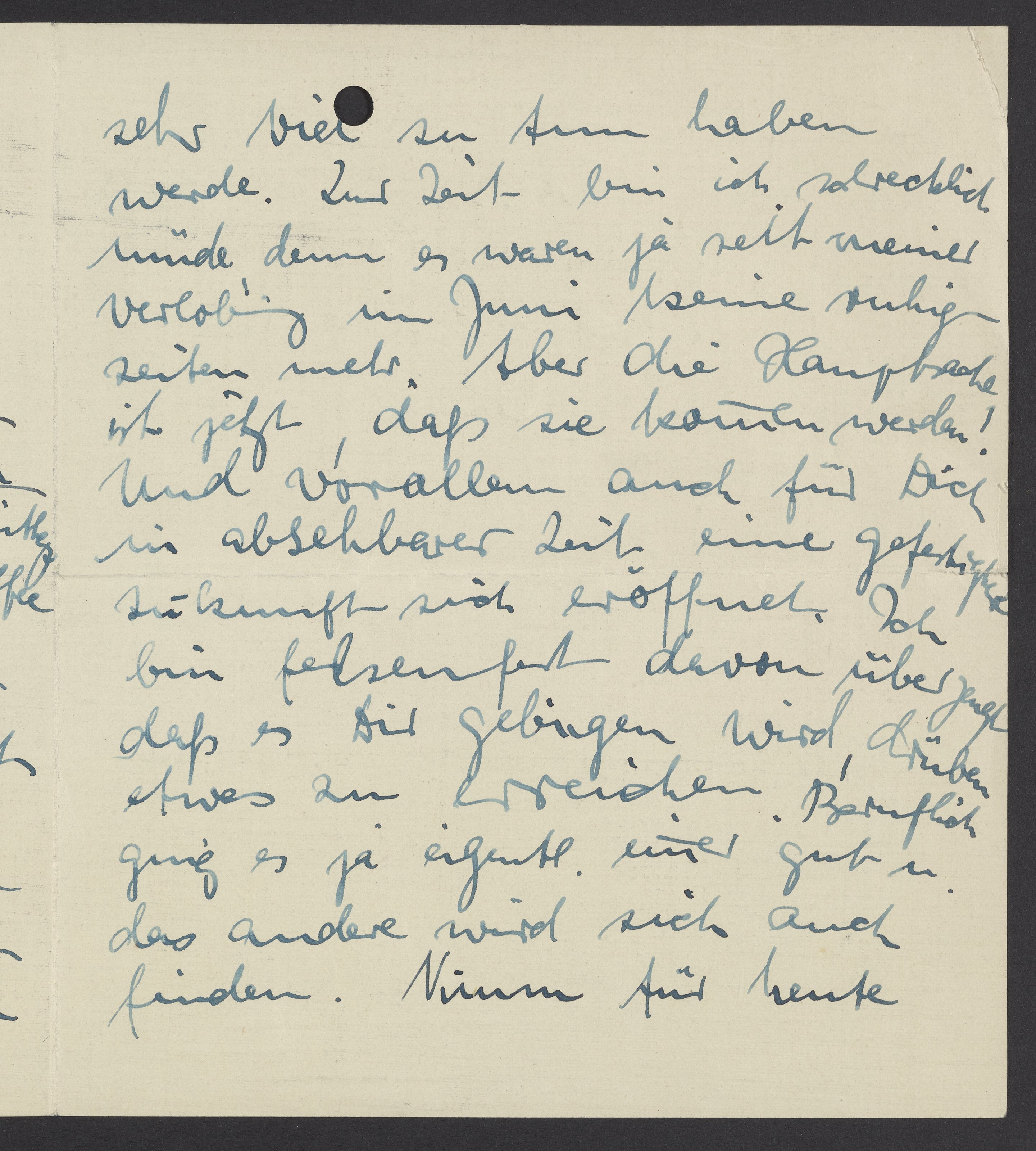 I’ll now have a lot to do. I'm terribly tired now, especially since I haven't peace or quiet since I became engaged in June. My main joy at the moment is that they will come. Above all, you will have a bright future! I am absolutely convinced that you will be successful over there. You will do well professionally and everything else will work out.