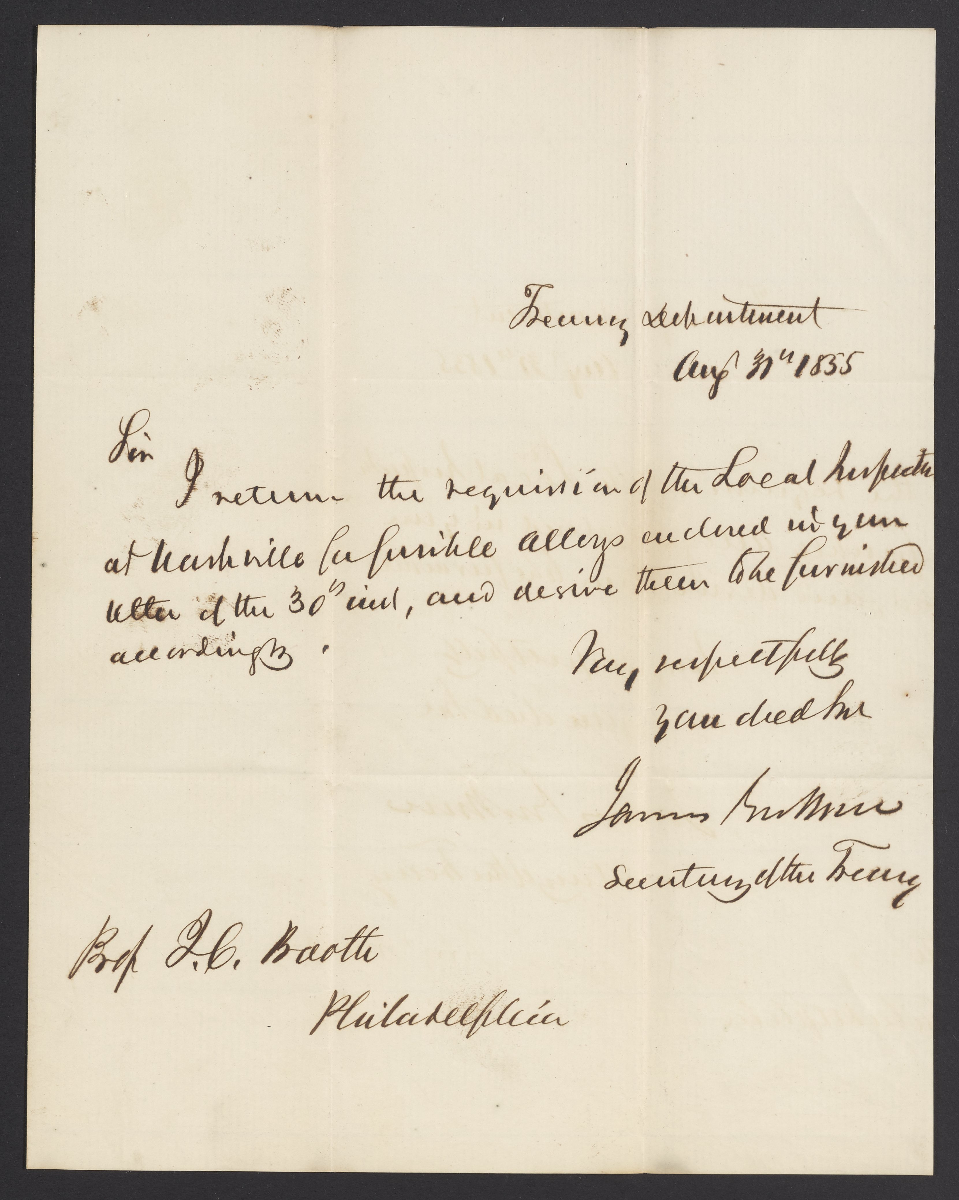 Small JPG1200 x 1501px — 172 KBLarge JPG2880 x 3601px — 844 KBFull-sized JPG3322 x 4154px — 1.1 MBOriginal fileTIFF — 3322 x 4154px — 39.5 MBJames B. Guthrie (1792 - 1869), United States Secretary of the Treasury from 1853-1857, writes to James Curtis Booth (1810-1888) with an order for fusible alloys from Nashville.