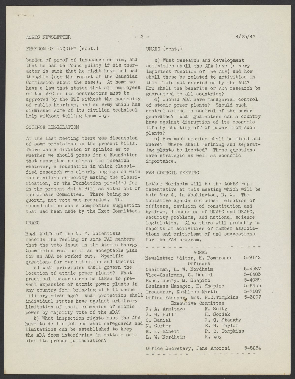 Association of Oak Ridge Engineers and Scientists. “Newsletter for the Association of Oak Ridge Engineers and Scientists (AORES), April 25, 1947,” April 25, 1947. Papers of Georg and Max Bredig, Box 10, Folder 3. Science History Institute. Philadelphia. https://digital.sciencehistory.org/works/1xcypww.