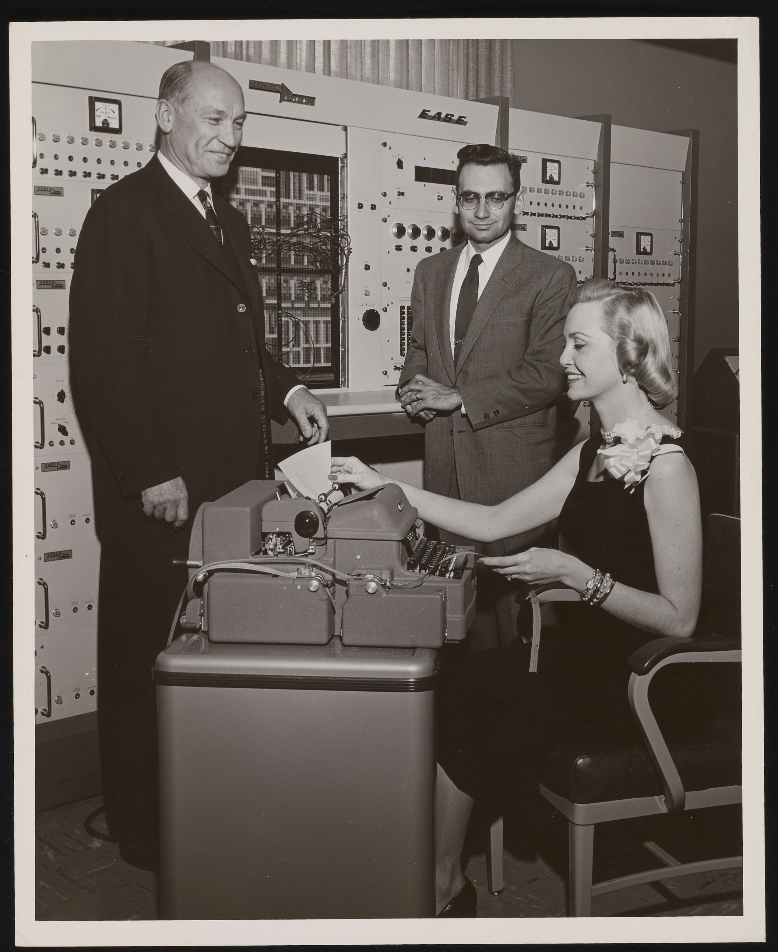 Rothschild Photo. “Arnold O. Beckman with EASE Computer,” 1950–1959. Beckman Historical Collection, Box 56, Folder 23. Science History Institute. Philadelphia. https://digital.sciencehistory.org/works/1z40ks800.