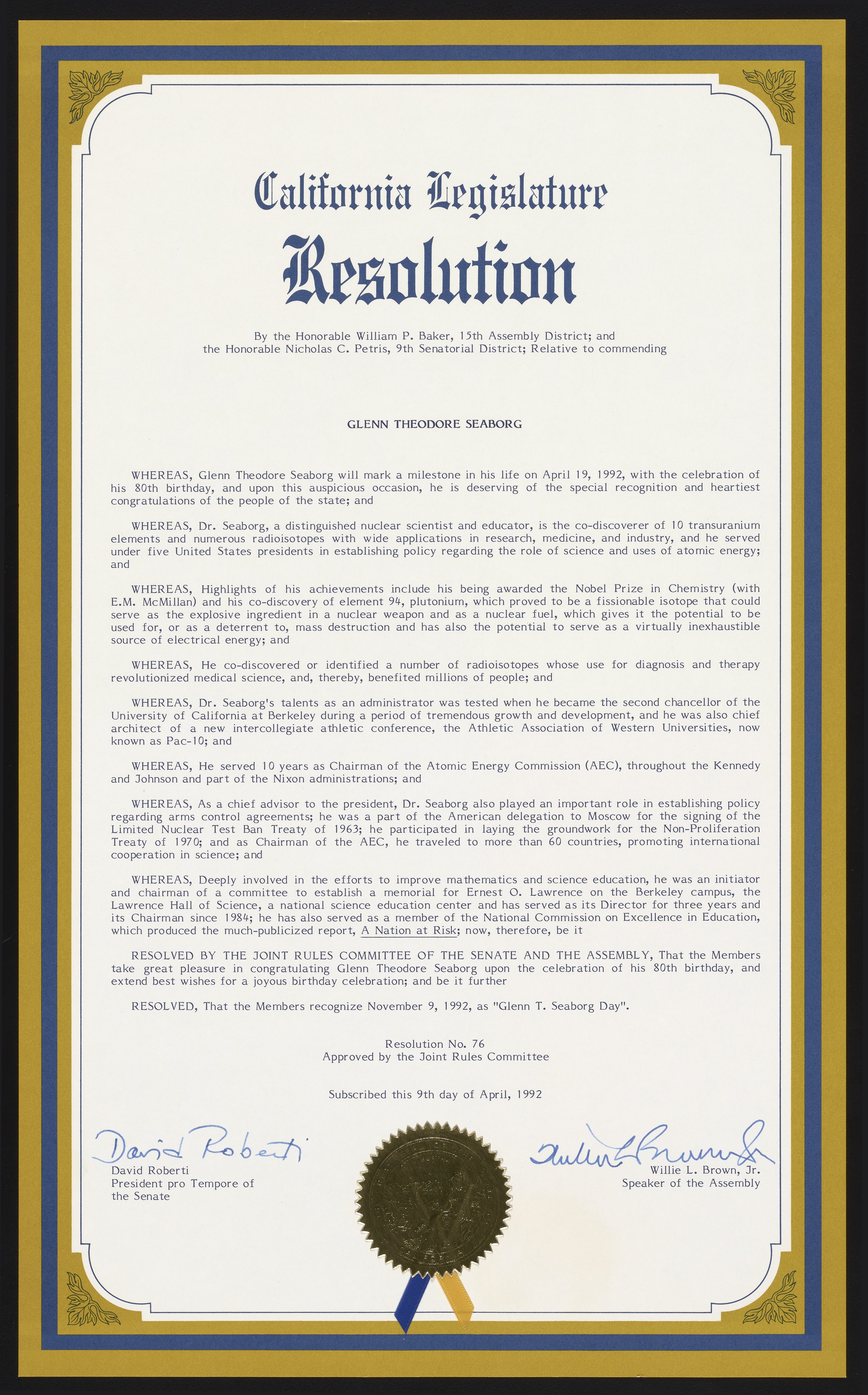 California. Legislature. “Resolution of the California Legislature Honoring Glenn Seaborg,” November 9, 1992. Records of the Lawrence Berkeley National Laboratory - Nuclear Division. Science History Institute. Philadelphia. https://digital.sciencehistory.org/works/1z40ks87x.