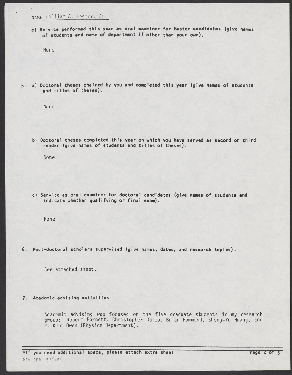 William A. Lester, Jr.'s bio-bibliography supplement form, 1988