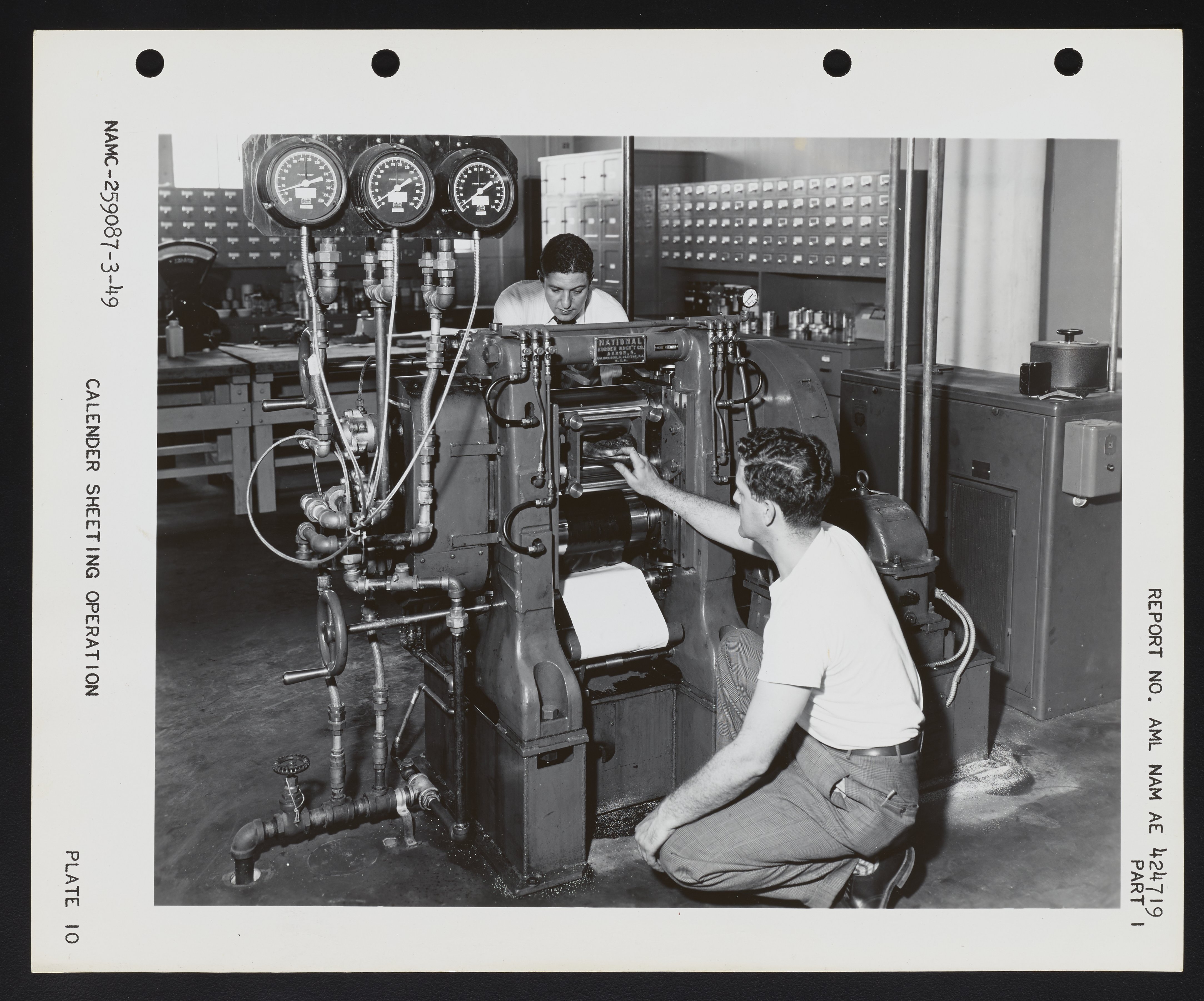 View of two engineers, Stanley Bilker (background) and Ralph Harper (foreground), operating the calender sheeting machine at the the Naval Air Experimental Station's Rubber Compounding and Processing Laboratory. The calender was a National Rubber Machine 6" x 12" three-roll type used to process rubber into continuous sheets of a pre-determined gauge and to friction and coat fabrics. Roll temperatures ranged from 50 to 350 degrees Fahrenheit and were controlled manually by circulating water, steam, or a mixture of both. This photograph was included in a 1949 Naval Air Experimental Station report on compounding rubber.