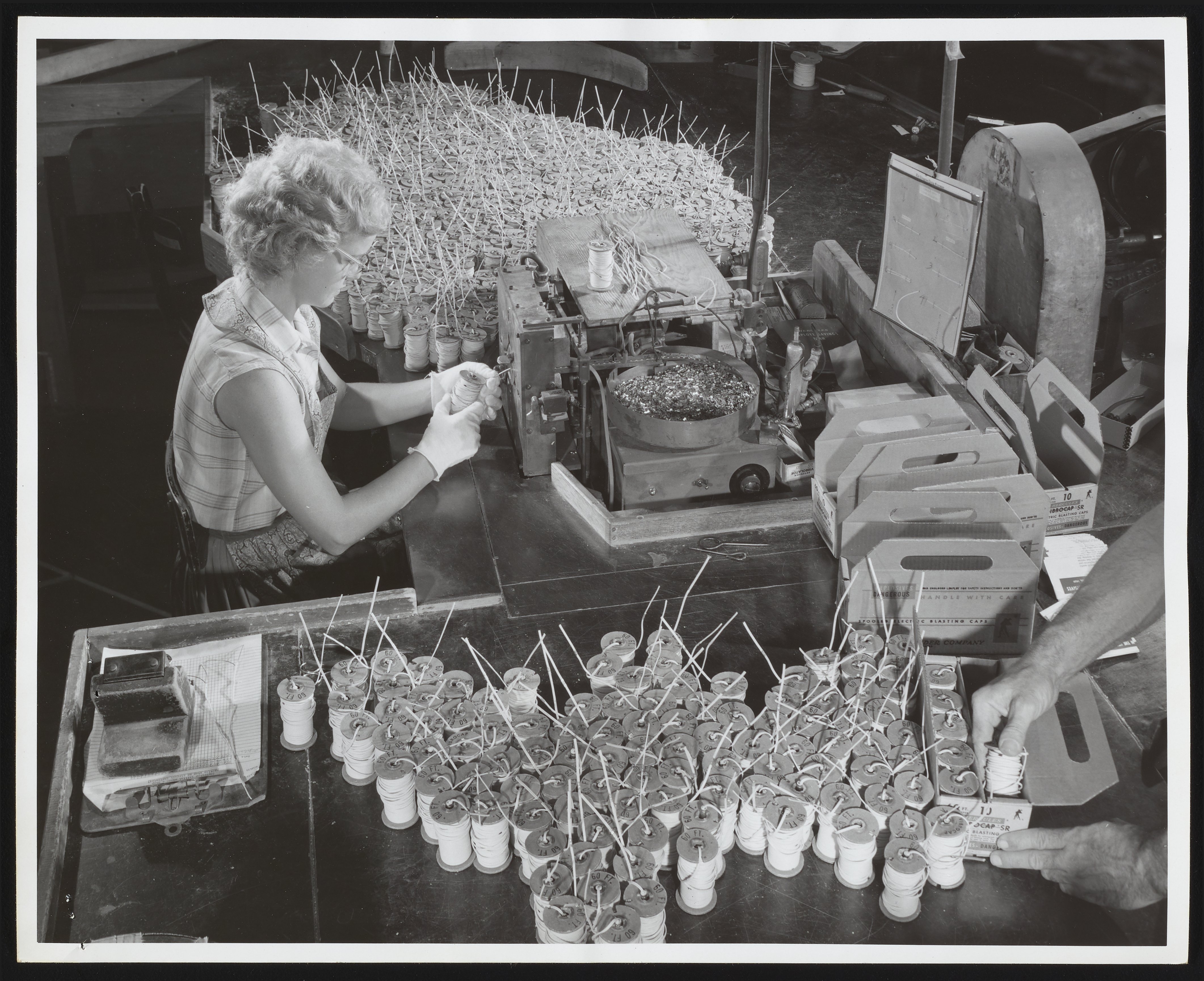 General view of employee Elizabeth Bailey applying shunts to spooled Vibrocaps manufactured at the Hercules Powder Company plant in Port Ewen, New York.