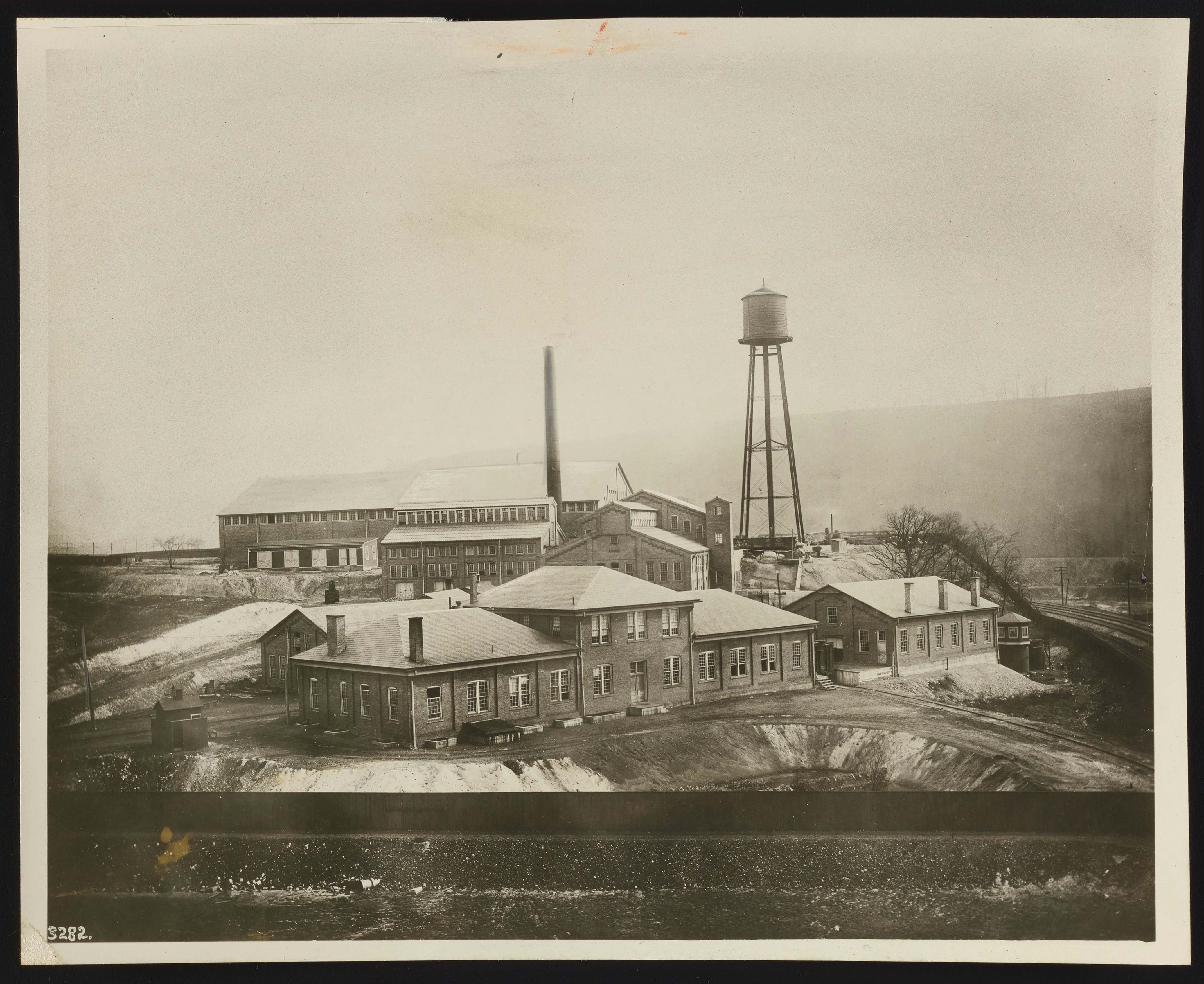 Elevated view of the exterior of the American Vanadium Company (later the Vanadium Corporation of America) plant facilities in Bridgeville, Pennsylvania. The Bridgeville chemical and metallurgical plant was used to smelt crude ore mined at the Vanadium Corporation's deposit in Mina Ragra, Peru to produce ferro-vanadium.