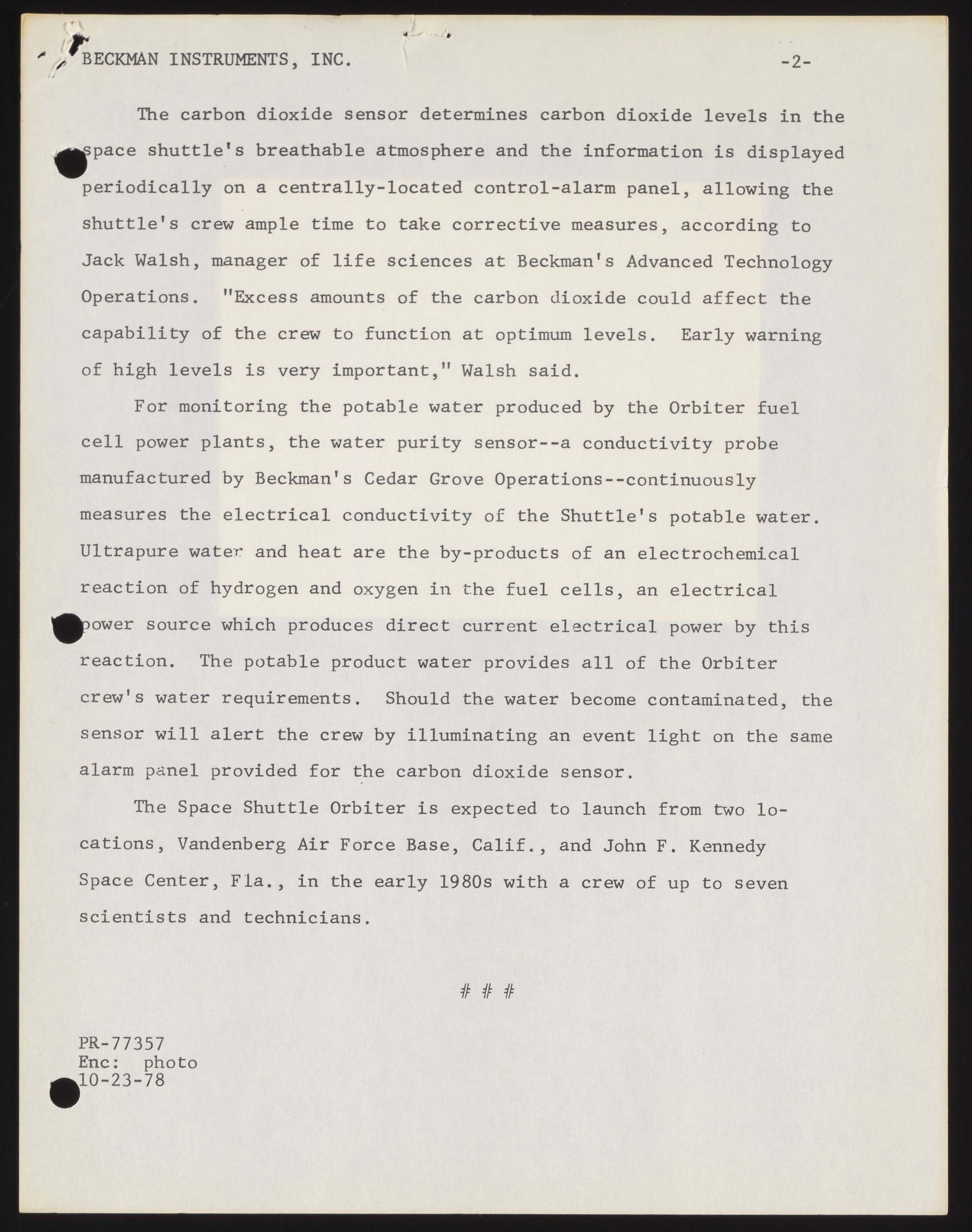 Eastman, Elke. “Beckman Develops Instruments to Monitor Life-Support and Electrical Systems on NASA Space Shuttle,” October 23, 1978. Beckman Historical Collection, Box 58, Folder 67. Science History Institute. Philadelphia. https://digital.sciencehistory.org/works/2227mq16q.