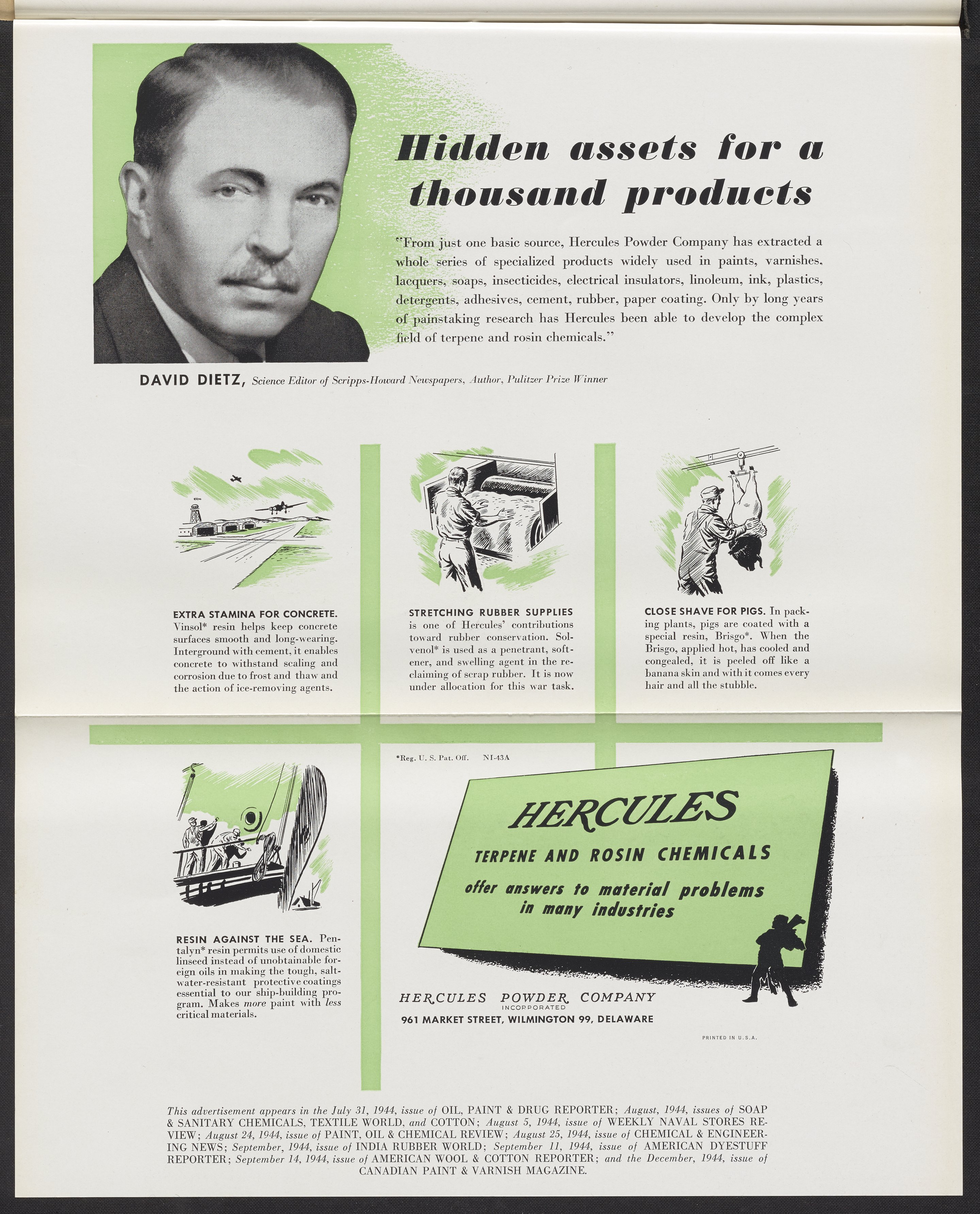 Hercules Incorporated. “Hidden Assets for a Thousand Products.” 1944 Hercules Advertisements, 1944. Records of Hercules Incorporated, Volume 1944. Science History Institute. Philadelphia. https://digital.sciencehistory.org/works/2227mq37g.