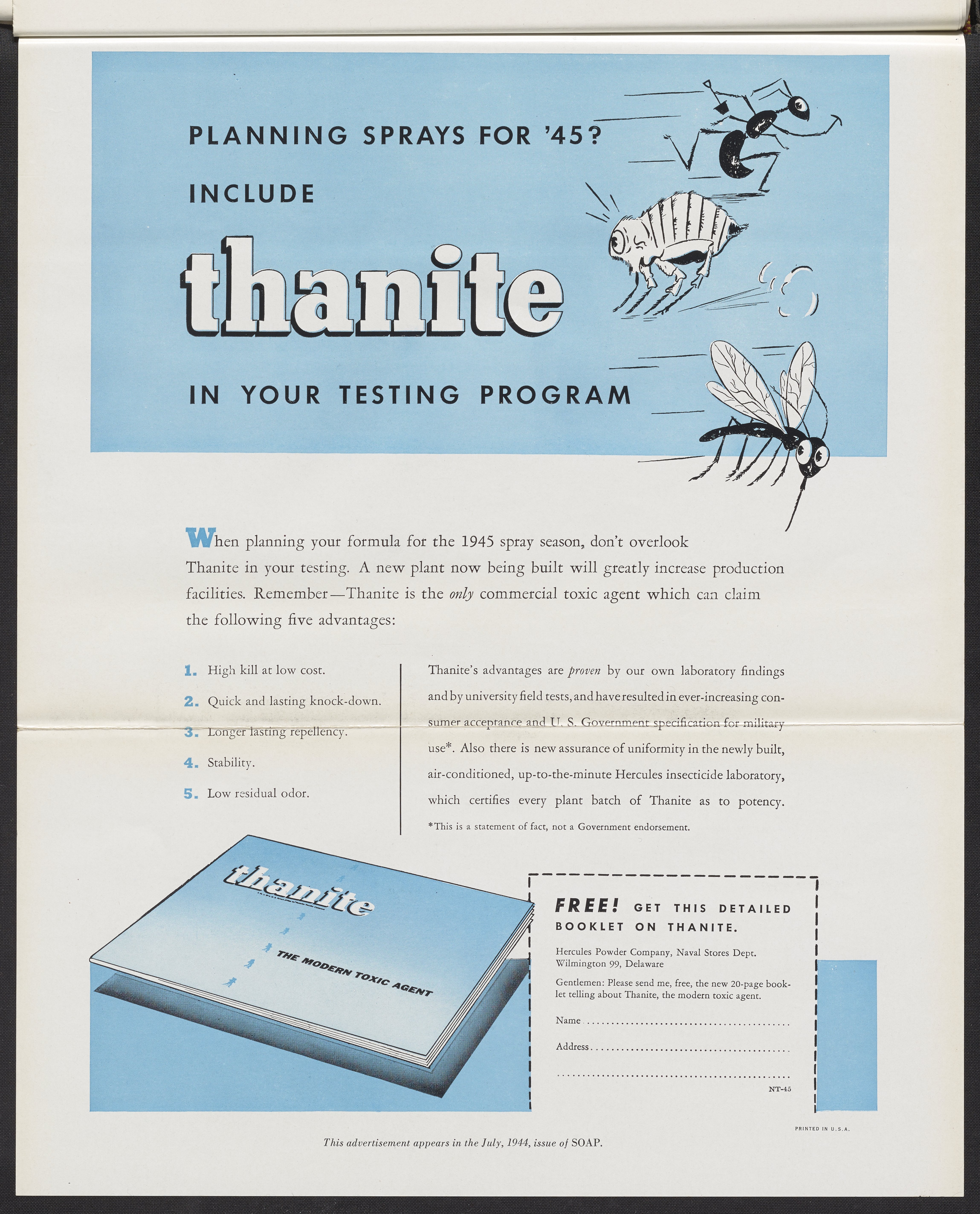 Hercules Incorporated. “Planning Sprays for '45? Include Thanite in Your Testing Program.” 1944 Hercules Advertisements, 1944. Records of Hercules Incorporated, Volume 1944. Science History Institute. Philadelphia. https://digital.sciencehistory.org/works/2227mq38r.
